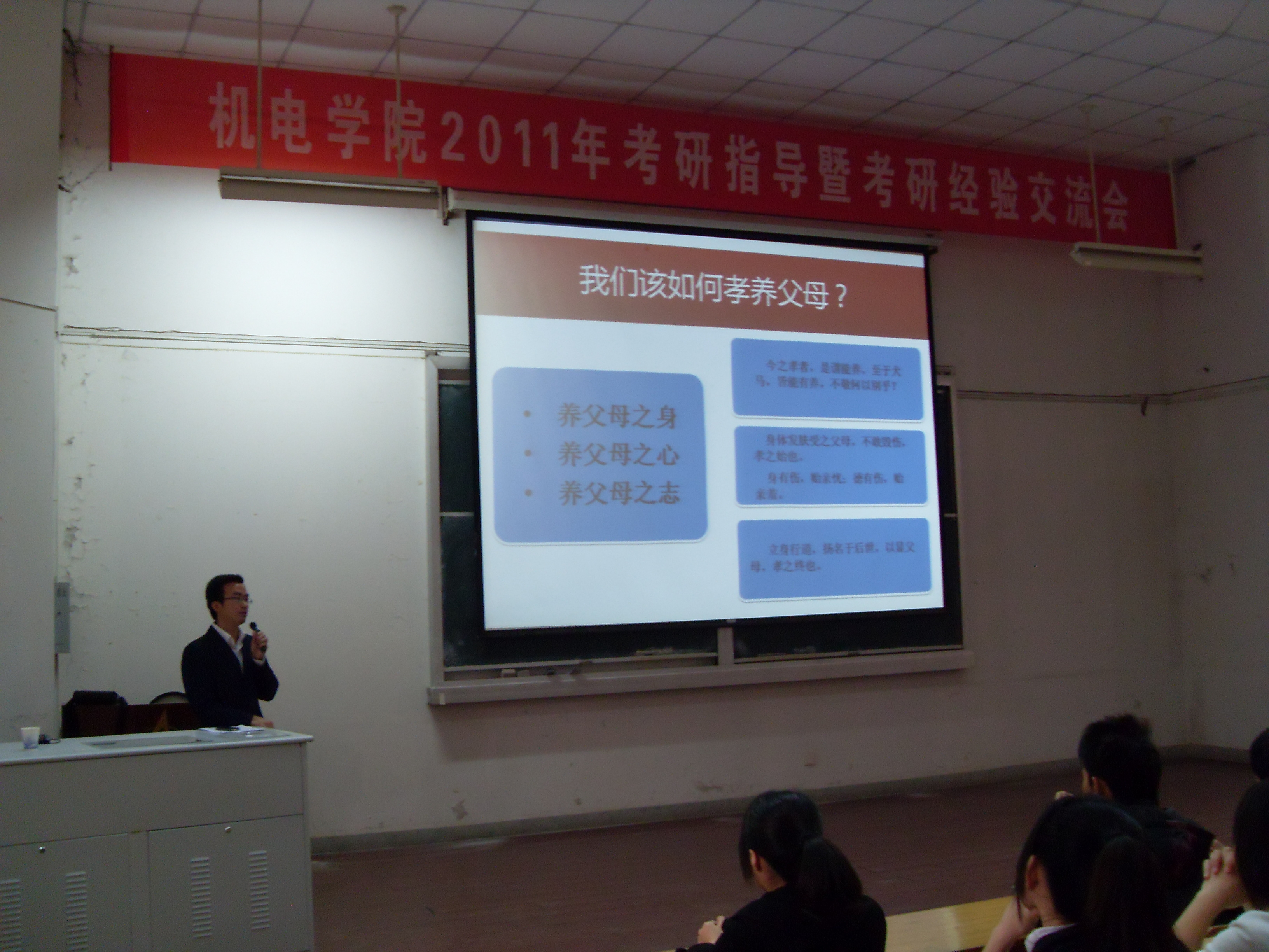 主题班会是辅导员老师对学生集中开展思想教育的重要阵地。为了进一步提高辅导员主题班会的设计和组织水平,促进相互交流相互学习。2011年11月10日上午在学校2教报告厅,学生处邀请了安徽师范大学文学院本科生辅导员吴青山来我校为数学111/2、工设111/2的班级学生召开了“感恩,孝亲,责任”的主题班会。各学院学生工作分管领导和全体辅导员到场观摩学习。吴老师的班会从自身成长历程出发,结合中国传统文化,通过生动的PPT,讲述了何为“爱”,何为“孝”,教育和引导学生要知父母恩,报父母恩,孝亲不仅要做到养父母之身,更重要的是做到养父母之心,养父母之志。30分钟的主题班会,紧扣主题,入情入理,深深地感染着在场的师生。吴老师是用心和实际行动诠释着“感恩”这一主题的,他在大学读书期间组建了“五四爱心学校”,和志愿者共同开展无偿家教活动, 2010年发起 “五四爱心基金”,帮助贫困学子完成学业,因事迹突出被授予第十四届“中国青年五四奖章”。