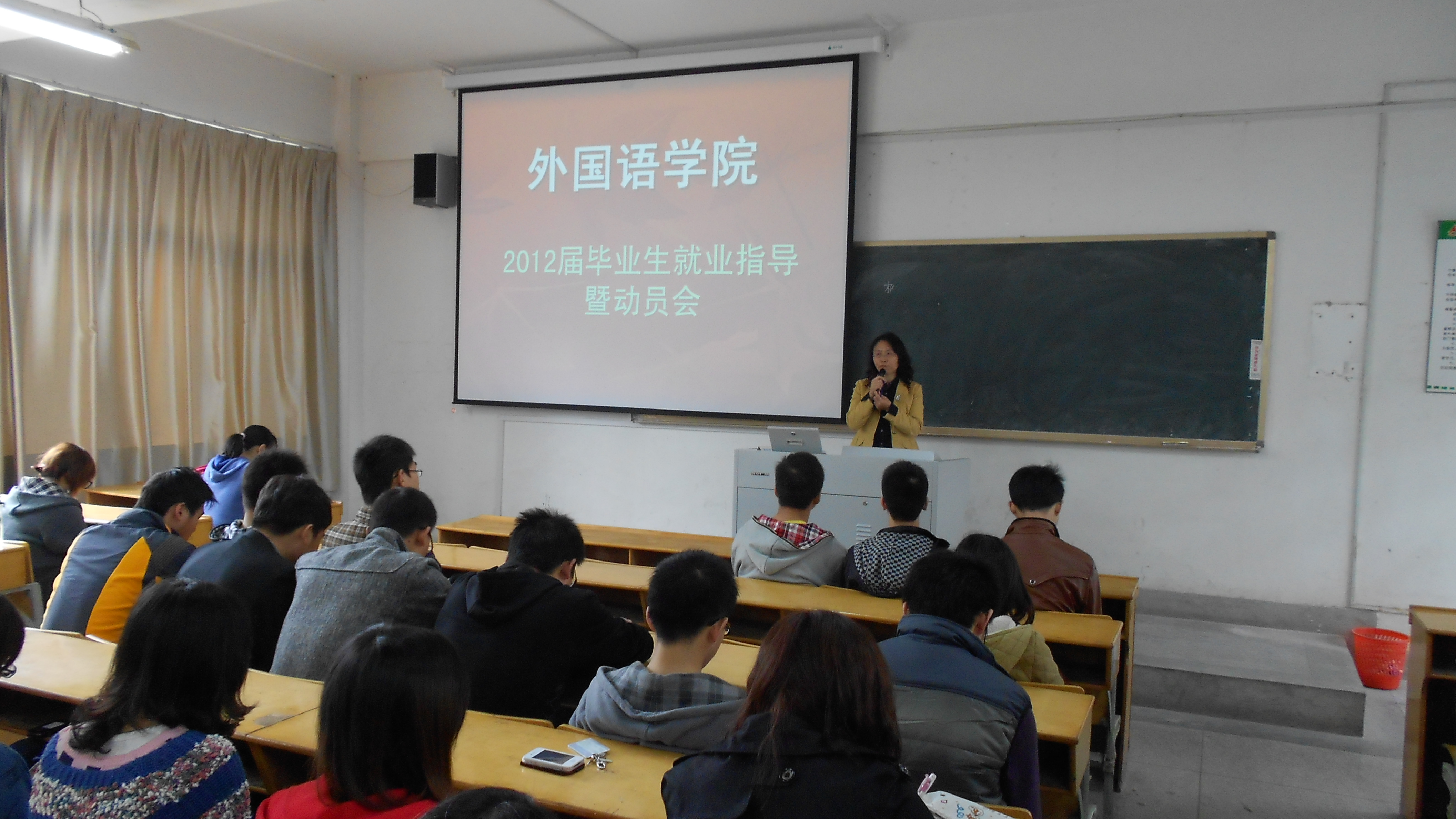 今年上半年,在2012届毕业生乃是大三学生的时候,即开展以“走进职场、展示自我、自信起跑”为主题的大学生求职简历制作暨模拟招聘大赛,通过简历制作、无领导小组讨论和模拟招聘会等三个环节全方面考察学生的专业知识和综合能力。同时,外国语学院还邀请了学工部部长、学生处处长、就业指导中心主任王河为同学们做了一场题为《精心准备、迎接挑战》的就业指导讲座。通过这次活动,让学生通过亲自求职体验,理论联系实际,掌握就业技巧,居危思安,及早规划。 目前,正值就业的最佳时机,为督促2012届毕业生尽早落实就业单位,外国语学院于 根据学院就业工作的整体安排,外国语学院将进一步贯彻党中央和教育部对2012届毕业生就业工作的指示精神,引导学生基层就业,关注困难学生,服务学生,采取“一对一”的帮助与指导,狠抓落实,努力提高毕业生的就业率和就业质量。