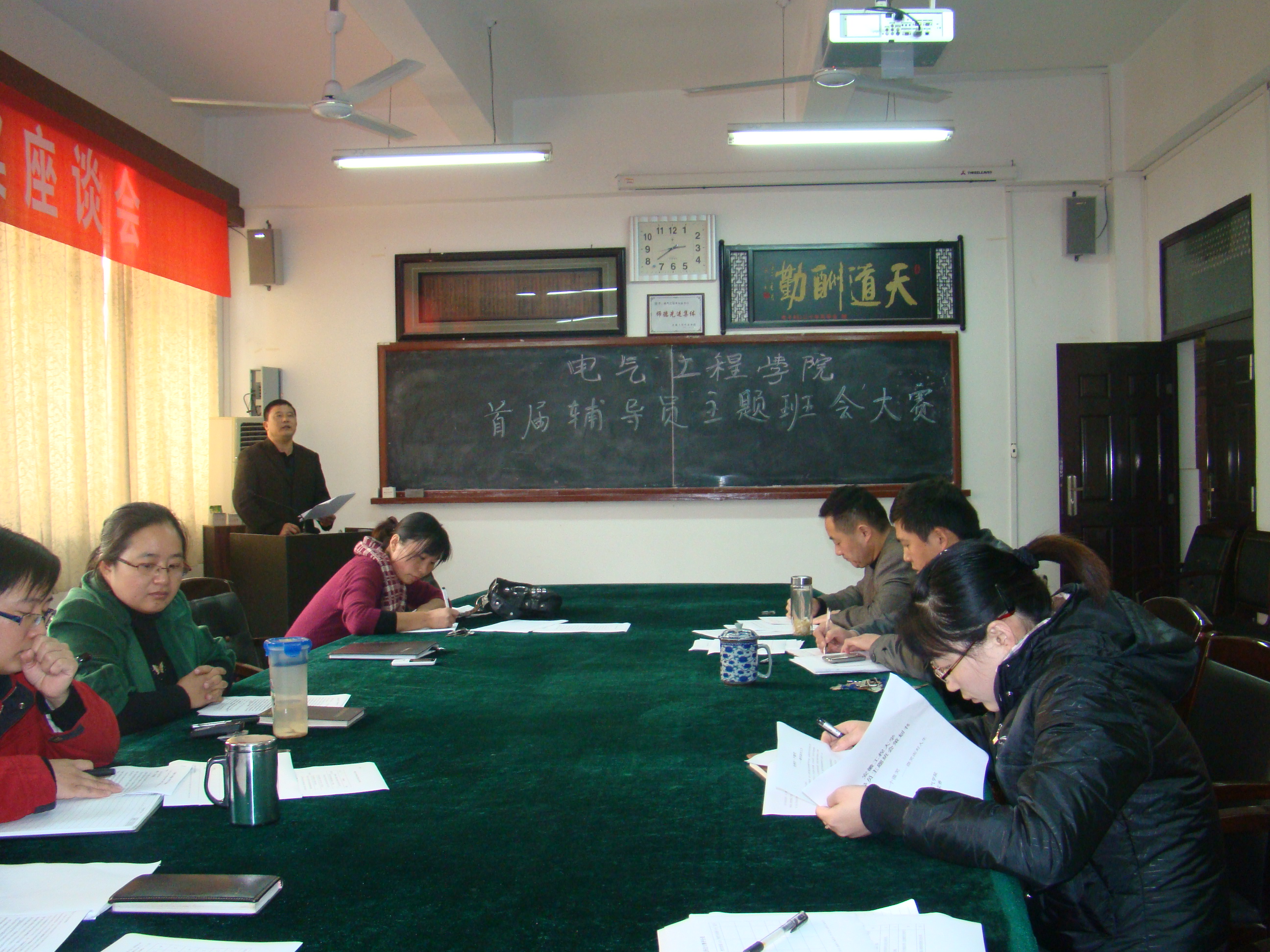电气工程学院七位辅导员根据学生日常工作生活实际,结合各班学生特点,以“感恩教育”、“心理健康教育”、“遵纪守法、文明礼仪教育”、“大学生人际关系”、 “大学生涯设计”、“冬季消防安全教育”和“文化素质教育”为主题分别进行了20分钟左右的班会展示。各辅导员以精心的设计方案、丰富的教育素材、亲切的情景设计、激昂的演讲技巧展示出一堂堂生动的班会,给人亲临其境之感。经与会人员评比,比赛选拔蔡金平和朱洪浪两位同志代表电气工程学院参加学校的辅导员主题班会决赛。