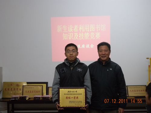 由校关工委、团委及图书馆联合举办的“新生读者利用图书馆知识及技能竞赛”,是图书馆第六届读者服务宣传月活动的重要内容,也是传统活动内容,已连续几年举行。本次竞赛共有12个学院组队参赛,经过激烈的角逐,最后纺织服装学院荣获团体一等奖,人文学院等荣获团体二等奖,生物与化学工程学院等荣获团体三等奖。自动化111胡颖飞、纺织112李效东、法学111殷正勇3位同学分获“上机检索”、“笔试”、“按号找书”单项比赛第一名。肖学东、徐军等为获奖代表队和个人颁发了奖牌、证书和奖品,并与获奖队代表在西图书馆门前合影留念。