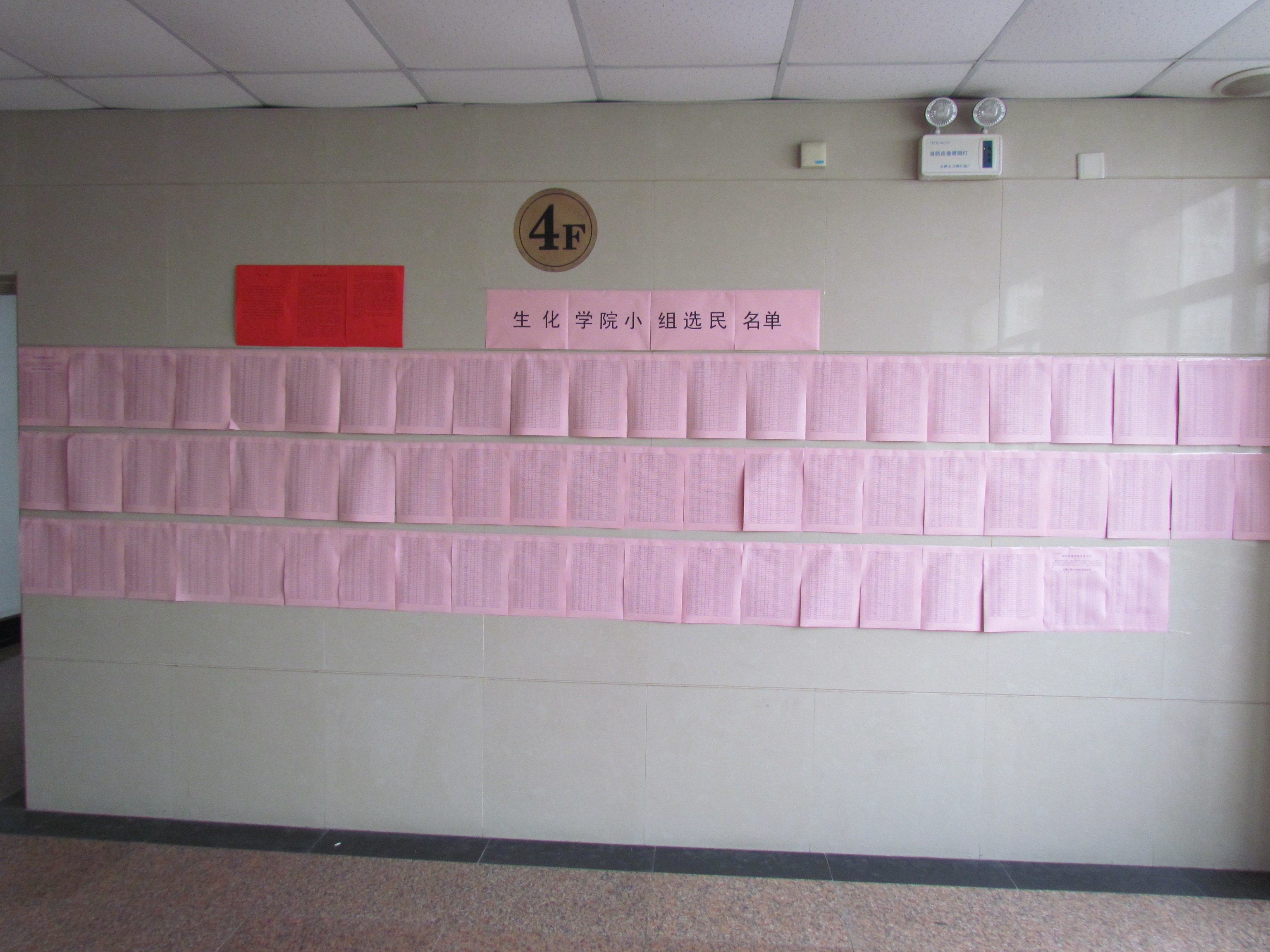 按照人大代表选举工作法定的程序要求,12月14日生化学院选举小组完成选民登记工作并在学院大厅内张榜公告。本次选举,将于1月4日在A座一楼大厅内如期举行。
