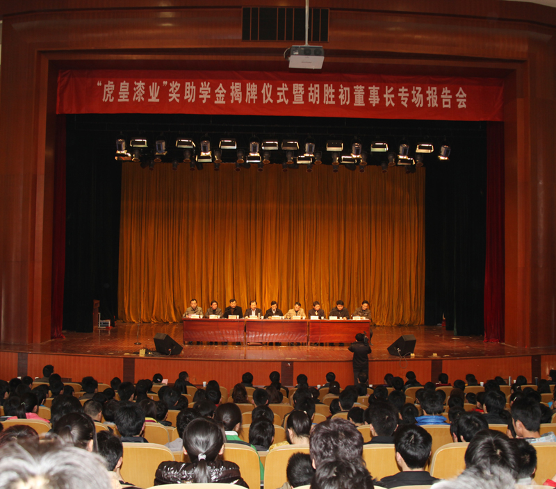 3月14日下午,机电学院“虎皇漆业”奖助学金揭牌仪式暨胡胜初董事长专场报告会在校师生活动中心隆重举行。RayBetApp官网下载 副校长、机电学院院长李震,无锡市虎皇漆业有限公司董事长胡胜初、副总经理邱作为、党群工作办公室主任庄浩勋,RayBetApp官网下载 教务处处长柴阜桐、学生处处长王河;RayBetApp官网下载 机电学院党委书记张国友、副院长伊长文、副书记郭全根等同志出席本次揭牌仪式并在主席台就座。仪式由伊长文同志主持。机电学院全体教职工及1300多名学生代表参加了会议。
