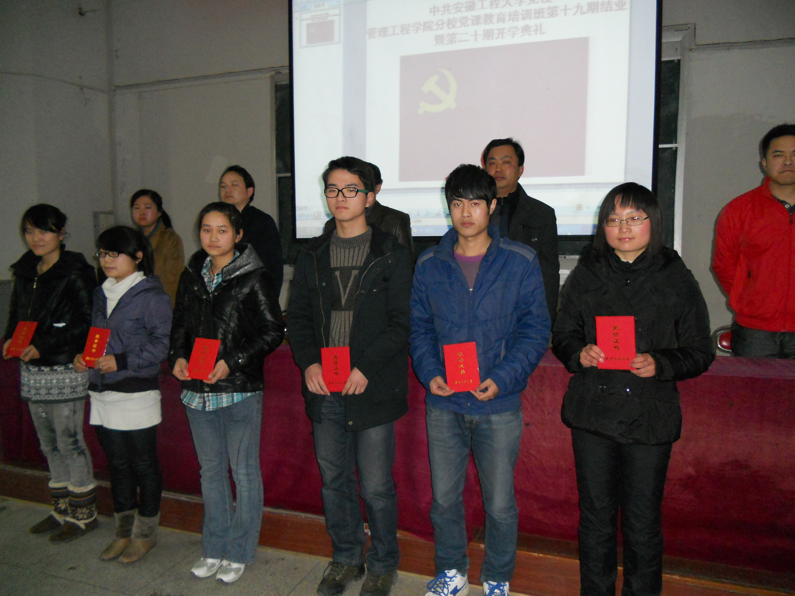 老师宣读了我院2010-2011年度国家奖学金获得者名单和第十九期党校优秀学员名单,三位国家奖学金获得者均为我院党校培训班学员,