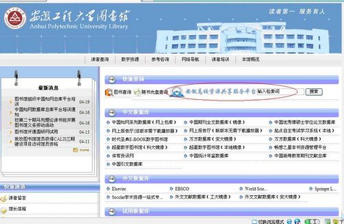 安徽高校资源共享服务平台是安徽省高等学校数字图书馆的一个子项目,其目的旨在通过馆际互借和文献传递实现安徽省内各高校资源的共知和共享。目前,该平台包含安徽省内各高校图书馆的中外文数据库,有图书、期刊、会议论文、学位论文、专利、标准、视频等文献类型,能够帮助我校读者查找到其所需的文献资源并直接用电子邮箱进行文献传递。