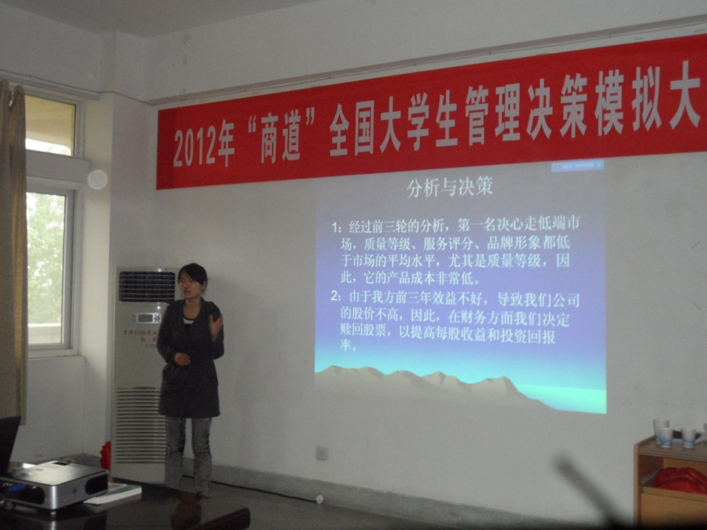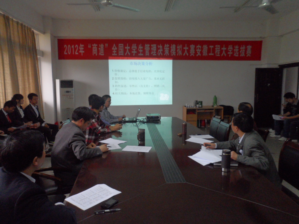 2012年“商道”全国大学生管理决策模拟大赛RayBetApp官网下载 选拔赛由学校教务处主办,管理工程学院承办,经过管理工程学院团委、学生会的精心组织宣传,在学校领导的关心下,以及各兄弟学院和现代教育中心等部门大力支持下,吸引了来自全校10余个学院的109支代表队的近400名学生参加。本次大赛旨在通过《商道》软件真正实现理论教学与实践相结合的人才培养模式,让学生在虚拟的计算机世界中体验完整的企业经营过程,形成正确的企业经营思路和管理理念,其内容涉及企业整体战略、人力资源、产品研发、生产、市场、销售、财务管理、团队协作等多个方面。比赛中选手们需结合企业经营中遇到的问题进行分析,发现机遇,制定决策,保证企业的成功及不断的成长。2011年“商道”全国大赛吸引了350多所高校,18000多支队伍参加。人民网、新华网、中国日报网等国内媒体对大赛盛况进行了报道,反响强烈。