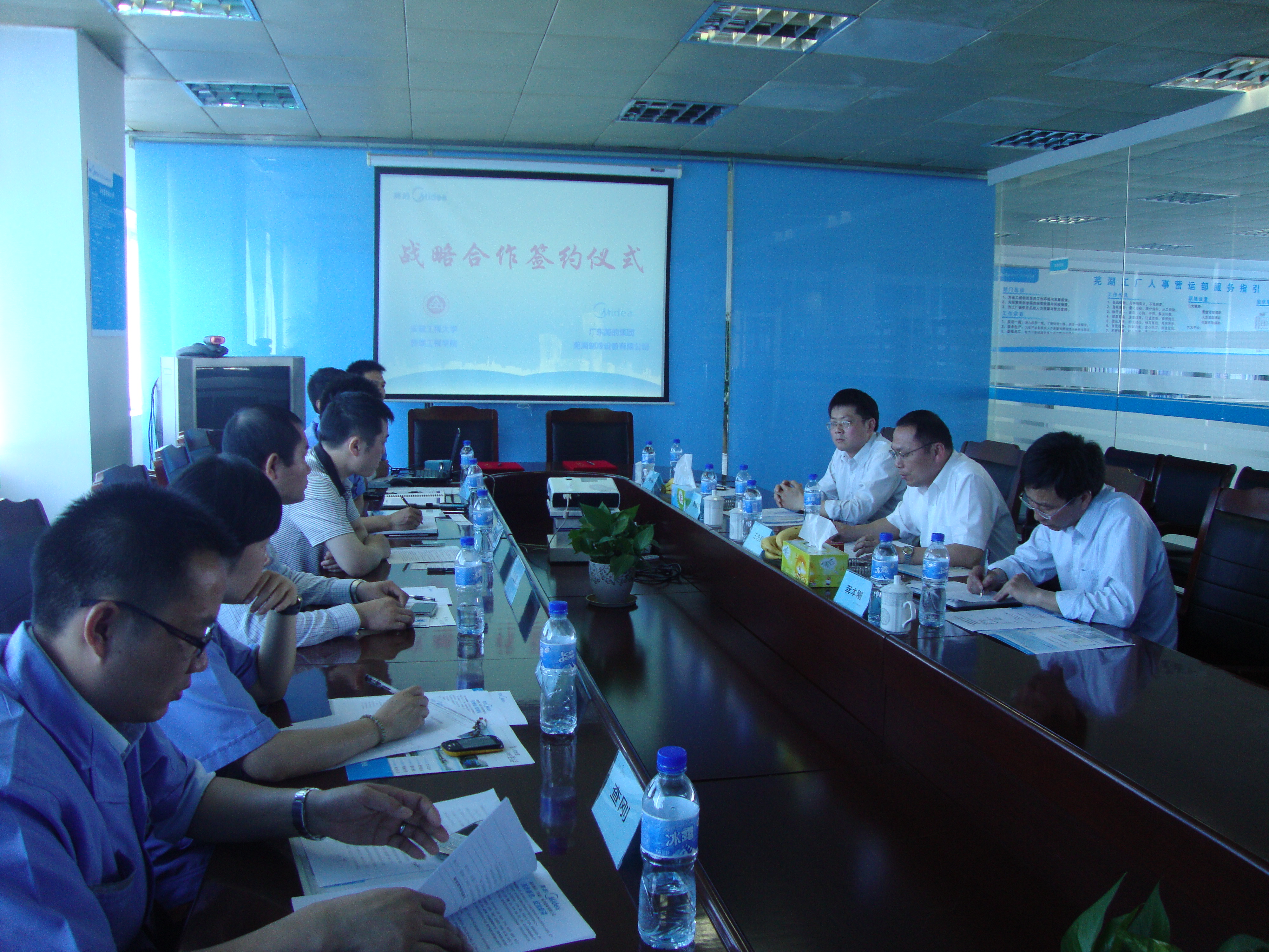 为进一步创新人才培养模式,推动产学研合作上新台阶,2012年5月14日上午,管理工程学院与美的集团芜湖制冷设备有限公司签订校企战略合作协议。参与此次签约仪式的主要人员有管理工程学院院长王忠群、副院长周晓宏、副院长龚本刚,美的制冷集团人力资源总监张文驰、芜湖美的制冷设备有限公司总经理周正良、副总经理陈小胜、生产部高级经理贾金铸、财务部高级经理全宏建、人力资源经理叶霞等参加了签约仪式,签约仪式在美的集团芜湖制冷设备有限公司举行。