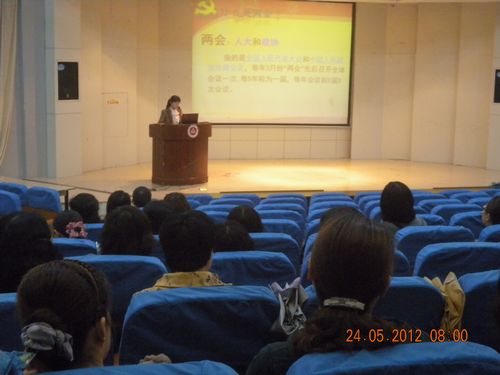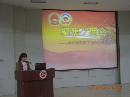 报告围绕两会的主题:迎挑战,凝聚“中国力量”;惠民生,感受“中国温暖”进行讲解,刘老师从2011年工作回顾、2012年工作总体部署、2012年主要任务三个方面解读了2012年《政府工作的报告》,带领大家一起回顾了2011的成就与不足,了解了中央政府对2012年工作总体部署,明确了我国今年在各个领域的主要任务。并从多方面详细解读了温总理的“18字方针”:“稳增长、控物价、调结构、惠民生、抓改革、促和谐。” 同时也指出了今年政府工作报告的一些关键词和亮点,如稳增长:GDP增长控制在7.5%;控物价:居民消费价格涨幅控制在4%左右;抓改革:调节贫富差距、和楼市调控等。