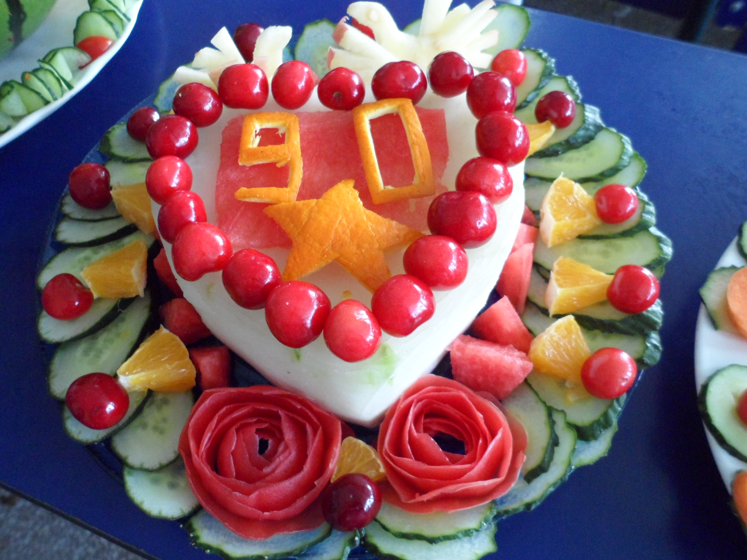 在比赛开始之前,11组参赛队伍早已跃跃欲试。在主持人宣布比赛正式开始之后,选手们即刻进入状态开始水果拼盘的制作。每个队伍共有30分钟的时间完成作品,大家分工明确,作品主题清晰。如有的参队伍采用了荷叶、西瓜、碎花做出扬帆起航概念的作品,还有的作品利用香蕉制作企鹅,形象生动活泼,更有参赛队以建团90周年的主题创作了带有90字样的瓜皮拼盘,多种蔬果的结合让整个作品看起来丰满而富有创意。参赛作品不仅在视觉上给人留下深刻印象,参赛队员的刀工也出奇制胜,他们通过自己神奇、灵活、熟练的手法,向人们展示了苹果变凤凰的精彩过程,现场众多观众发出了由衷的赞叹。