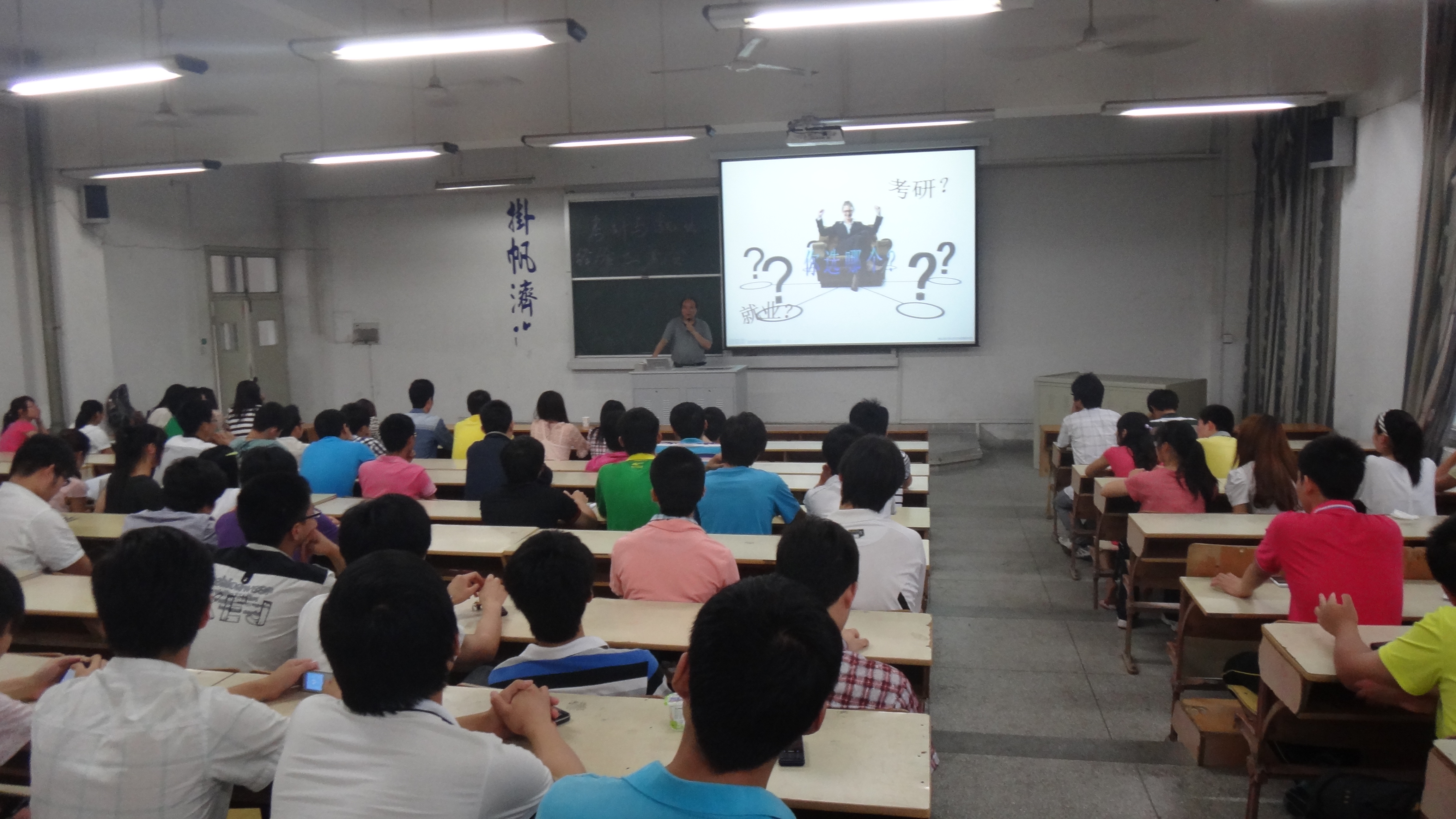 辅导员吴敏老师在之后的发言中,对学生考研或就业方面的一些细节作了可观的解释说明,并一致希望面临选择的学生要从自身的情况考虑,综合自己的兴趣爱好和能力,作出正确的选择,设计好人生的学业蓝图。应邀前来的大四代表们衷心与各位同学分享了自身考研与就业过程中的经验,并对考研和就业过程中的一些细节要求作了详细的说明。