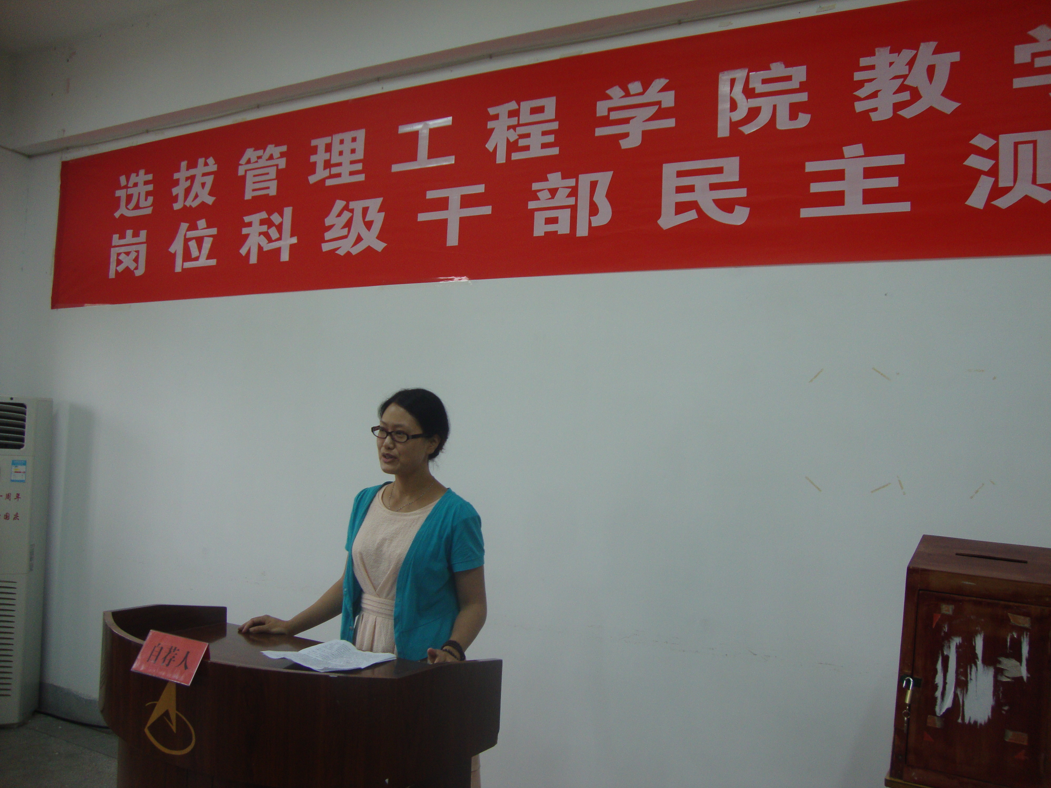 汪张林书记首先介绍了学院党委前期在选拔教学科研岗位科级干部所做的宣传、组织自荐和资格审查工作等具体情况,对符合资格审查的自荐人情况向与会人员做了详细说明。第二项议程为自荐经济贸易系主任或副主任岗位的三名教师分别就个人基本情况介绍、近几年的主要工作业绩以及对申报岗位的设想进行个人陈述。最后与会人员对申报8个岗位的15名自荐人进行了民主测评。