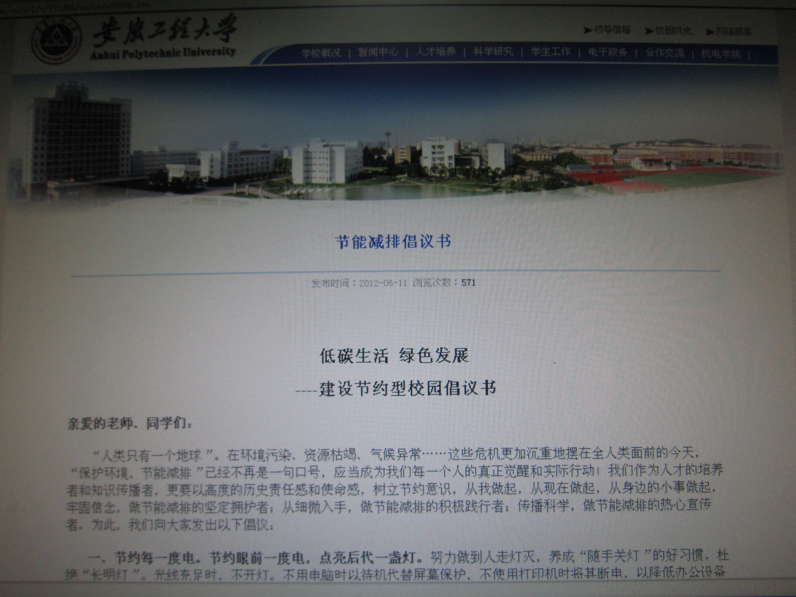 根据国家发改委等十四部委、省发改委17委厅局《关于2012年全国节能宣传周活动安排意见》的通知精神和学校领导批示要求,后勤服务集团会同校团委,利用网络、专栏等宣传阵地,通过横幅、展板、宣传栏、签名、节能小贴士以及组织在校学生开展节能活动等形式,向全校师生员工发出了“低碳生活,绿色发展”的倡议,号召大家以高度的历史责任感和使命感,积极加入到校园节能减排的行动中来,从我做起,从身边小事做起,节约每一滴水,每一度电,每一张纸,每一粒米……