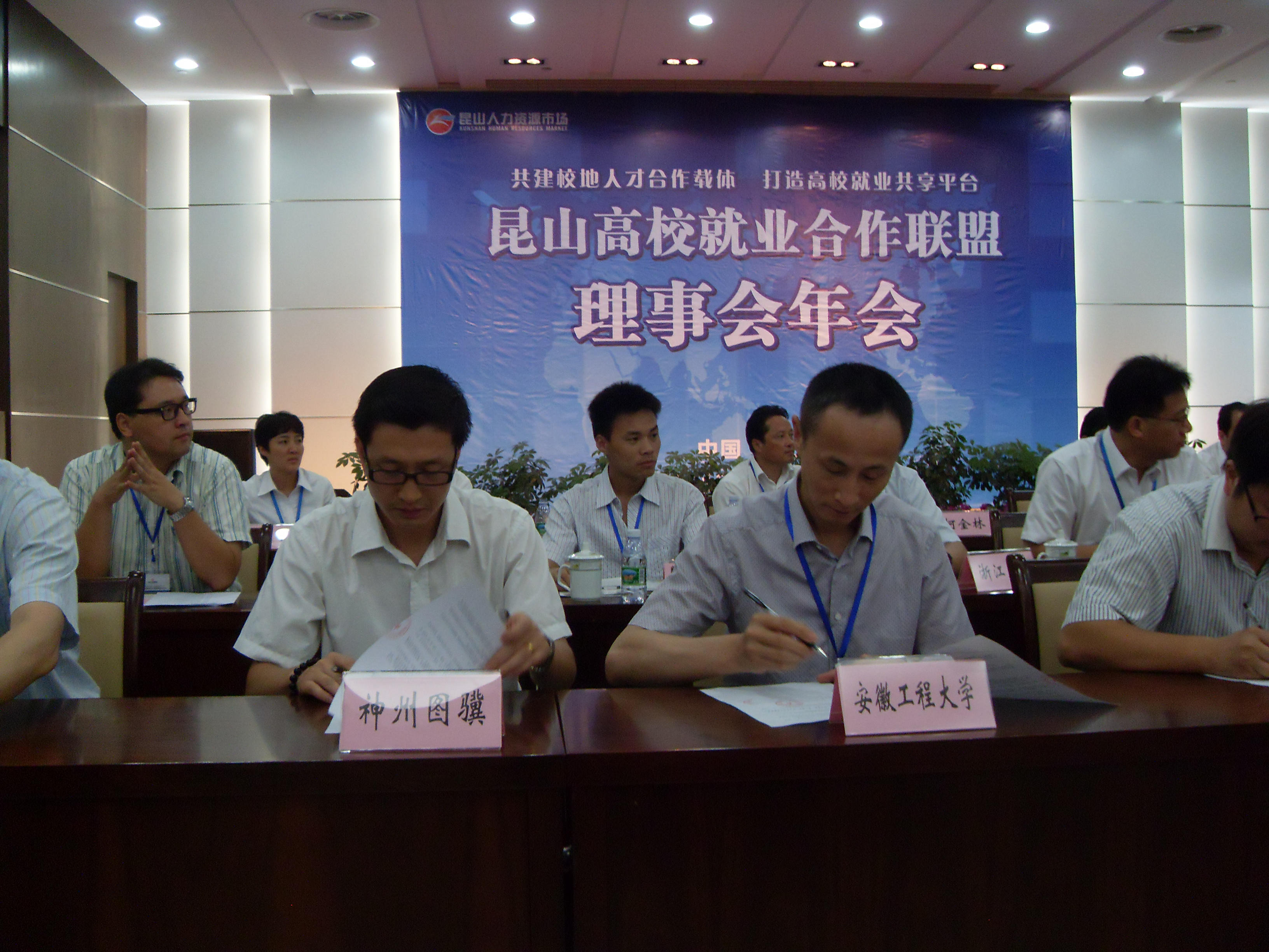本次年会旨在进一步加强高校与昆山市在人才供需方面的交流,构筑更加优质便捷的就业服务平台,探索建立完善的高校毕业生就业指导与服务体系,加强联盟高校与用人单位的沟通与合作。会议选举产生了昆山高校就业合作联盟第二届理事会,经过选举,共有8所高校确立为副会长单位,6所高校确立为副秘书长单位,35所高校确立为理事单位。我校被会议选举为副秘书长单位,并与神州图骥地名信息技术股份有限公司签订了人才供需合作协议。会议期间,王河一行还参加了昆山2012年“情系现代化”高校毕业生大型供需双选会。