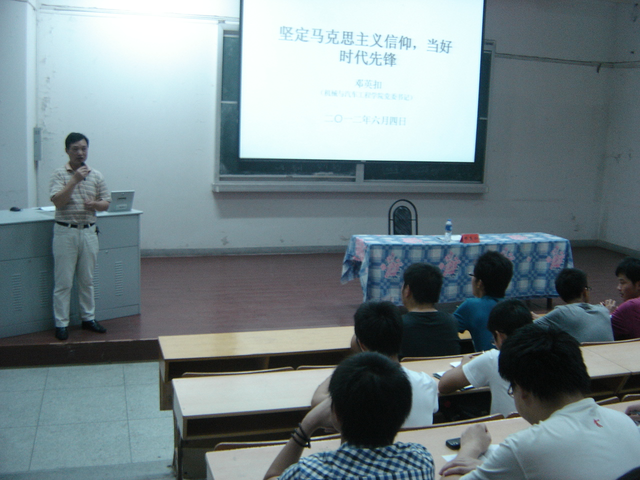 为了增强当代大学生责任意识,引导大学生树立远大理想,争做“有理想、有道德、有文化、有纪律”的四有新人,6月12日晚7:00,机械与汽车学院党委书记邓英扣老师在二教报告厅,以“坚定马克思主义信仰,当好时代先锋”为题做了一场精彩的报告会。第三期党员培训班学员以及第二十一期入党积极分子培训班学员认真聆听了报告会。