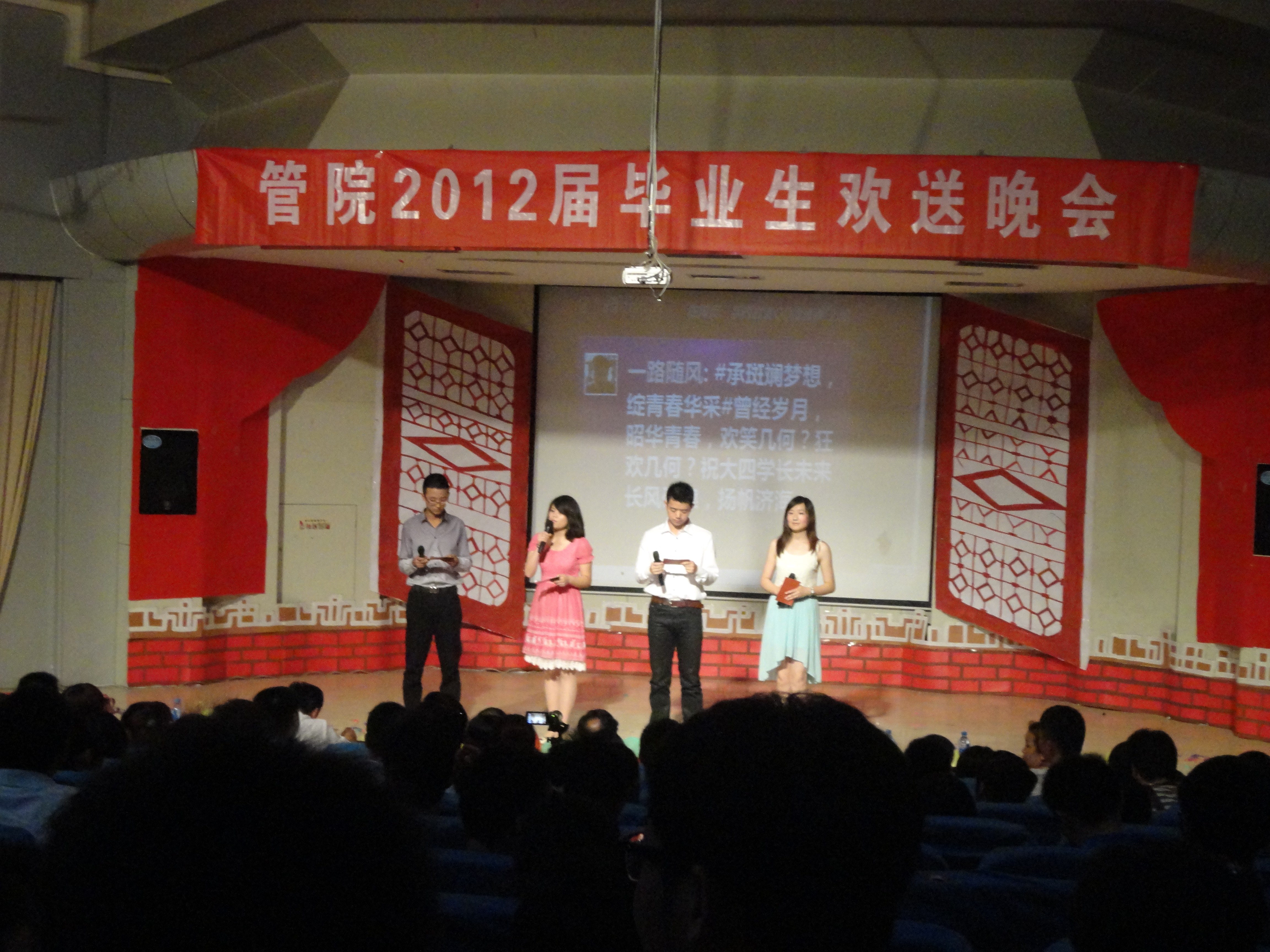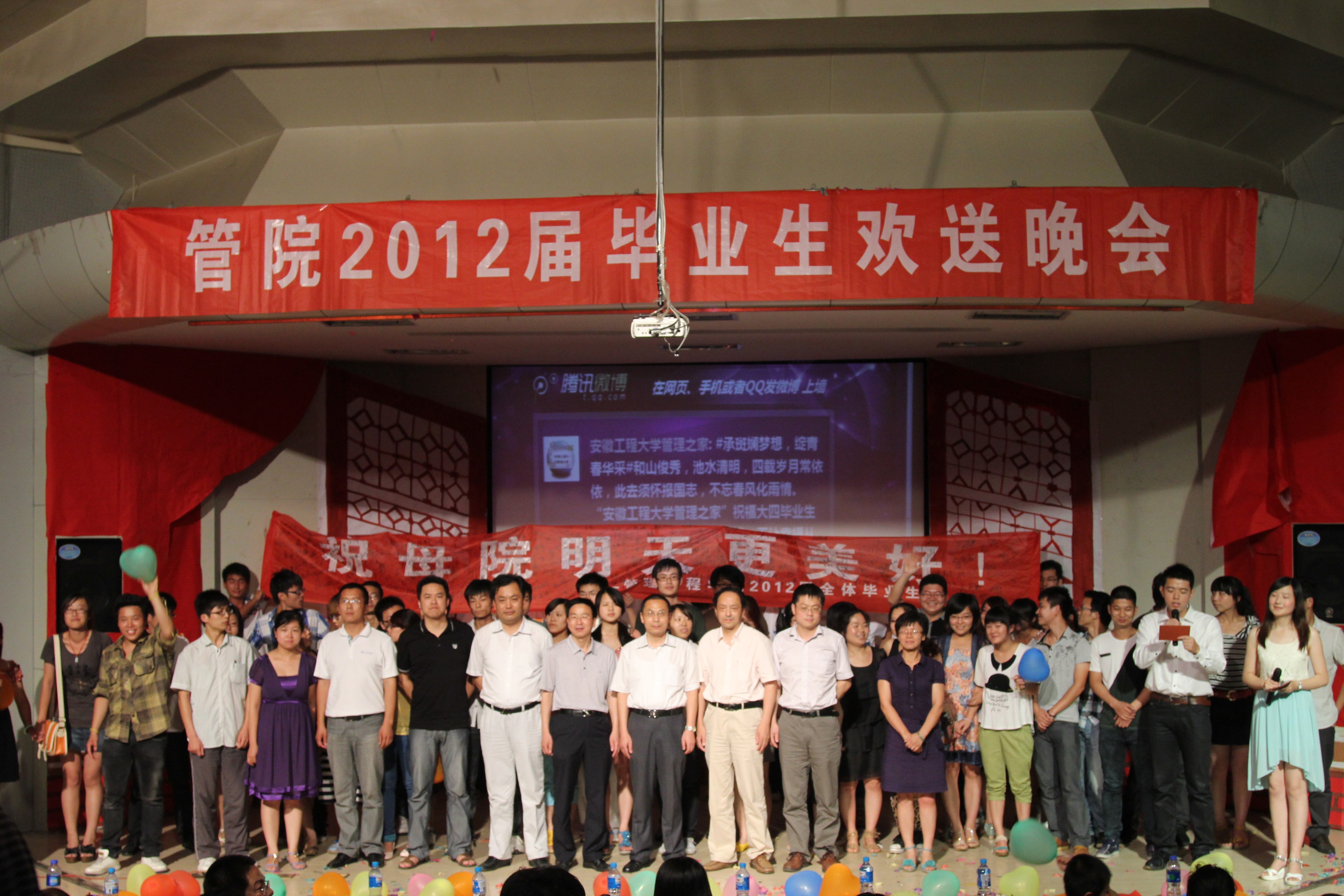 ,管理工程学院2012届毕业生欢送晚会在我校学术报告厅隆重举行。管理工程学院党政领导班子全体成员和毕业班辅导员及部分教师代表应邀出席此次晚会。管理工程学院2012届毕业生欢聚一堂,共叙离别之情。