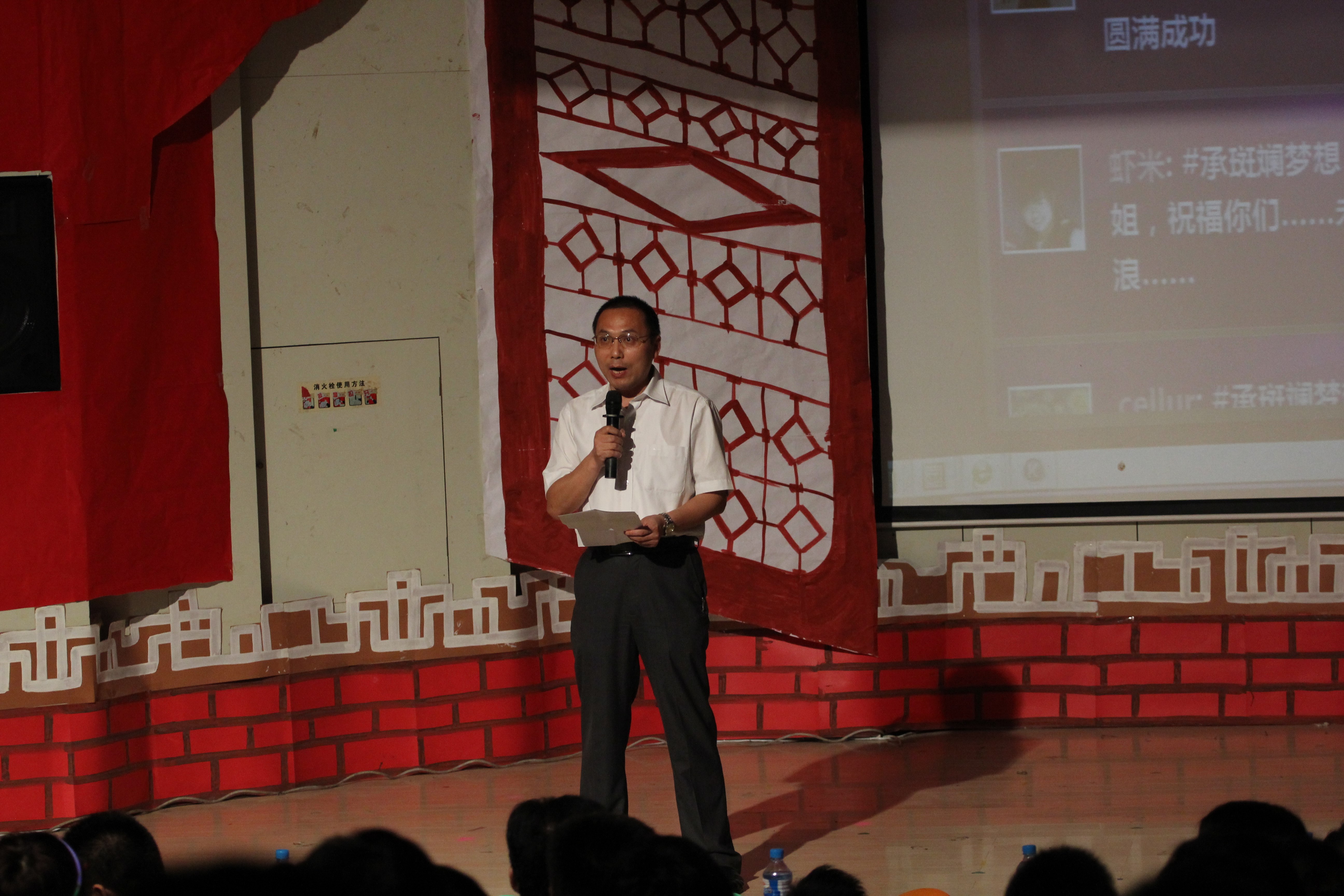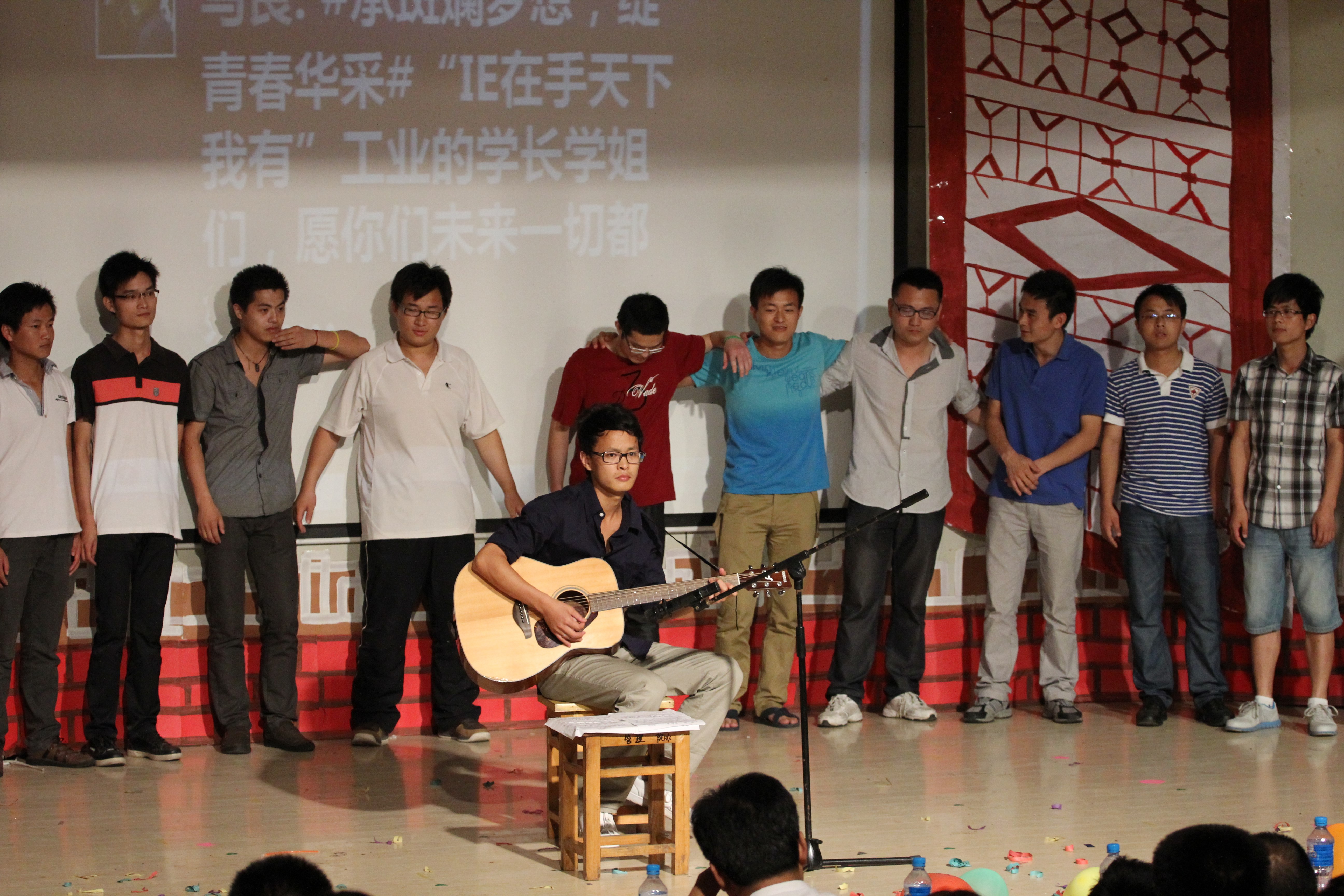 老师倾情弹奏了一曲《梅花三弄》,悠扬的旋律蕴藏着学院老师对同学们真挚的祝愿,毕业班辅导员徐晓平、沈明领和黄桂琴同时登台的合唱更是赢得全场热烈的欢呼声。互动环节“爱要大声说出来”中,众多毕业班同学们勇敢的走上舞台向大家表达了自己离别的不舍,讲述了自己大学四年的感受,对老师同学的感谢以及对管理工程学院这个大家庭的不舍情感。整场晚会过程中,现场观众纷纷通过“微博上墙”互动平台发送了感言、祝福、毕业感想等,晚会最后在学生会成员带来的歌曲合唱《这里没有陌生人》中圆满结束。