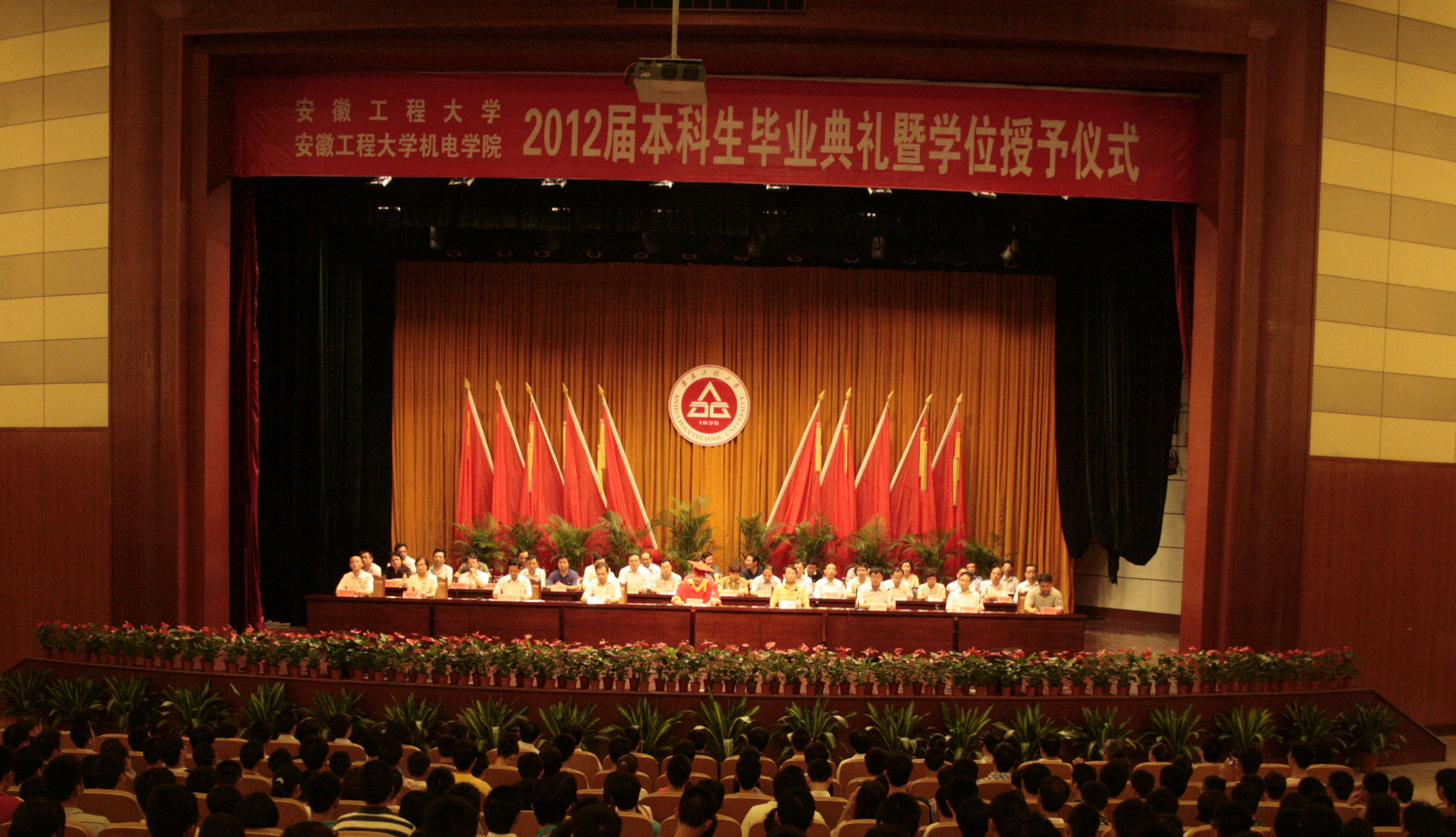 接着,副校长叶常林宣读了关于授予2012届毕业生学士学位的决定。干洪校长为每个学院的毕业生代表颁发毕业证书和学位证书并扶正流苏。副校长李震宣读了学校2012届优秀毕业生和安徽省2012年品学兼优毕业生表彰名单。主席台前排就座的各位领导为受表彰的毕业生先进个人代表颁发了荣誉证书。