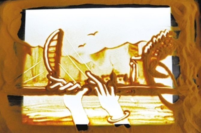 付斌同学在学习动画设计之余,为丰富自己的想象力和创造力,自学了沙画艺术。沙画是用沙子作画,和一般的美术作品相比,它的随意性、多变性、创意性更强。付斌认为,沙画与动画有很多相通之处,都是创作者自编自导的创意和设计过程,两者之间可以用相同的创意,只是沙画的表现形式更加简便、且创作周期更加灵活。