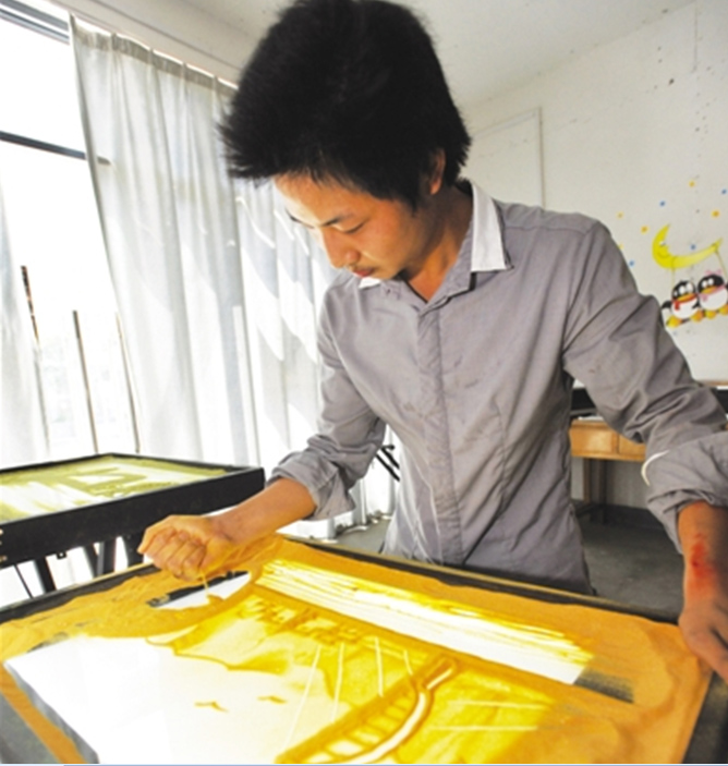 而促使付斌与沙画结缘的,也正是沙画的“创意性”。付斌来自湖南,目前在芜湖一所高校就读动漫专业,从小他就喜欢充满创意性的东西,他说之所以学习沙画创作,主要是缘于自己的热爱和一个偶然的机遇。“我觉得沙画的魅力,主要是可以用自己的思维去创造东西。”小付说,大二那年,他在动漫公司实习时,偶然接触了一本沙画书籍,从此“触电”沙画。随后,他花费5000多元,前往南京学习沙画创作,因为有一定的美术功底,仅仅用了19天,他就从外行变成了沙画创作的熟手。