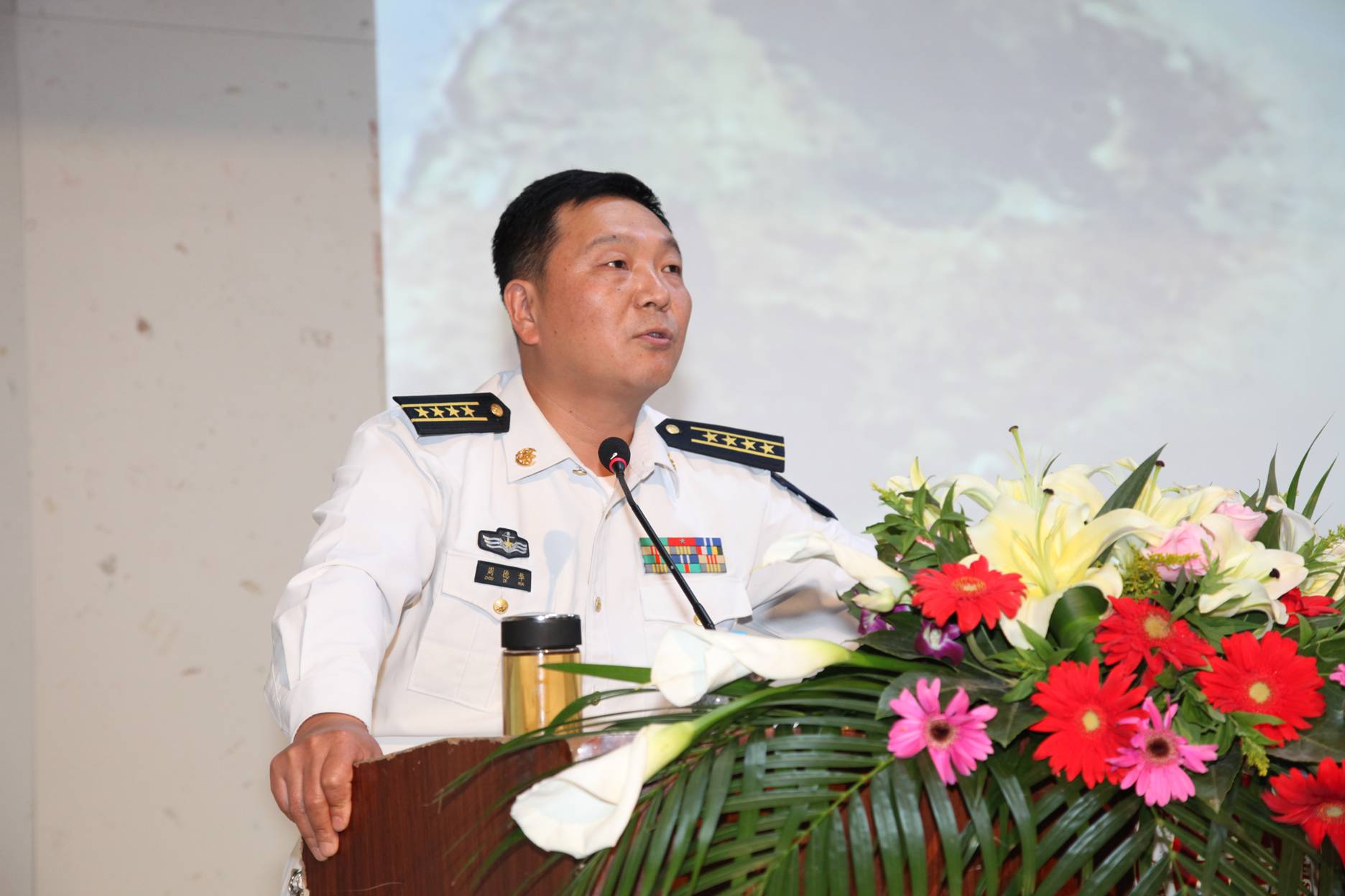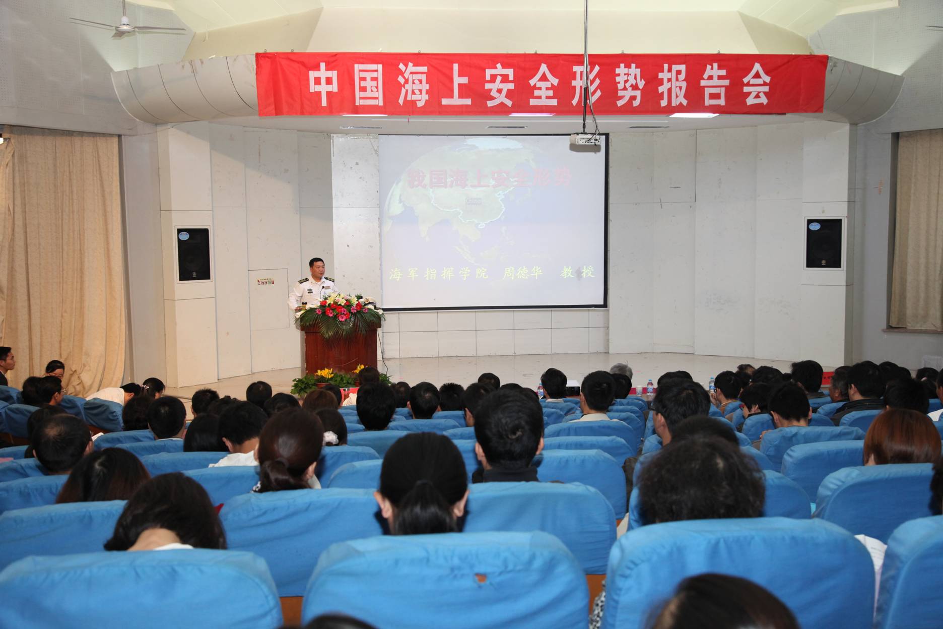10月18日下午,军事战略学博士、海军大校、中国人民解放军海军指挥学院周德华教授应邀为我校师生作了主题为“中国海上安全形势”的报告。校党政领导陈其工、干洪、方友实、汪奇燕、李震出席报告会。报告会由校党委委员、宣传部部长苏国红主持。