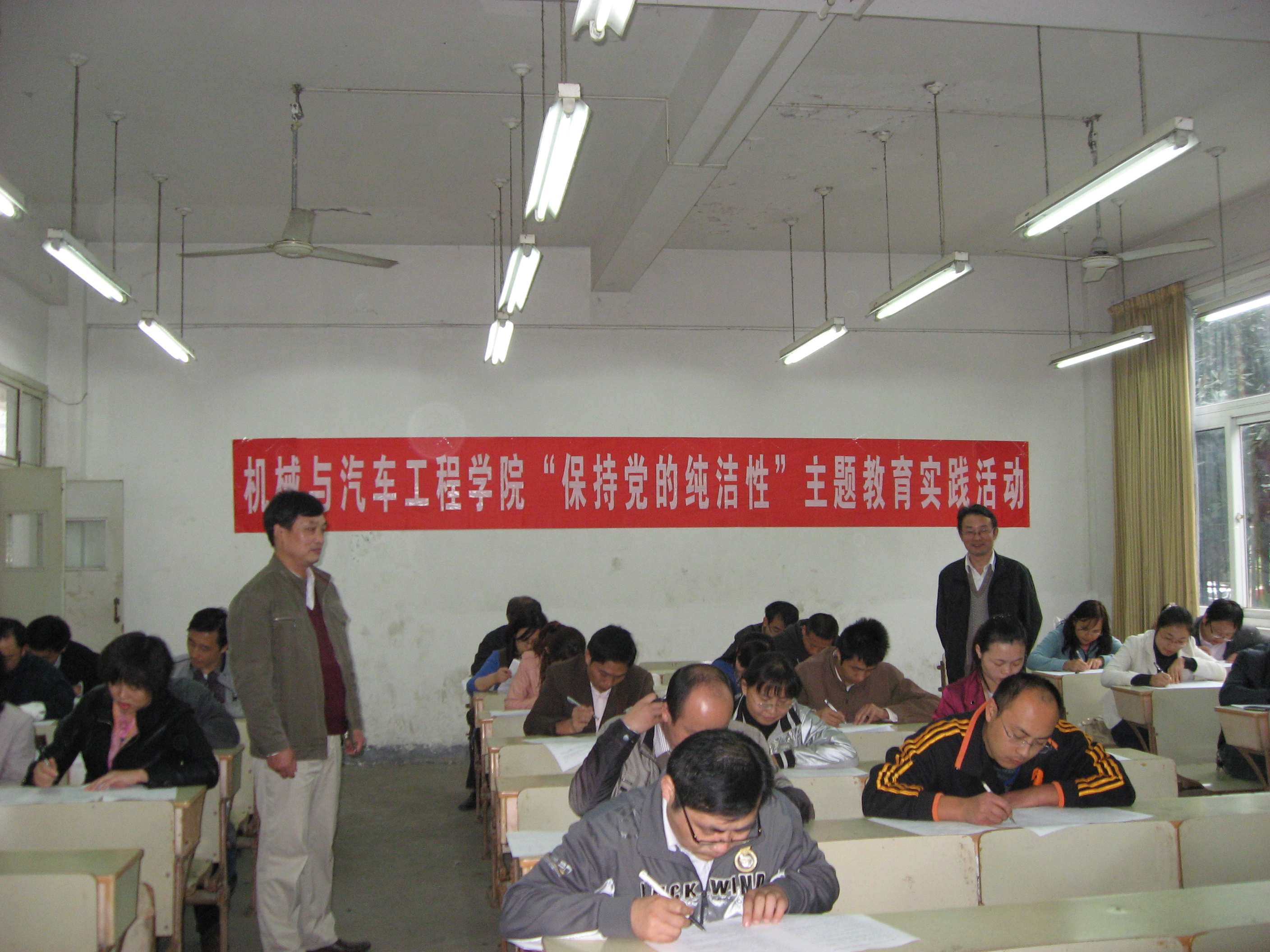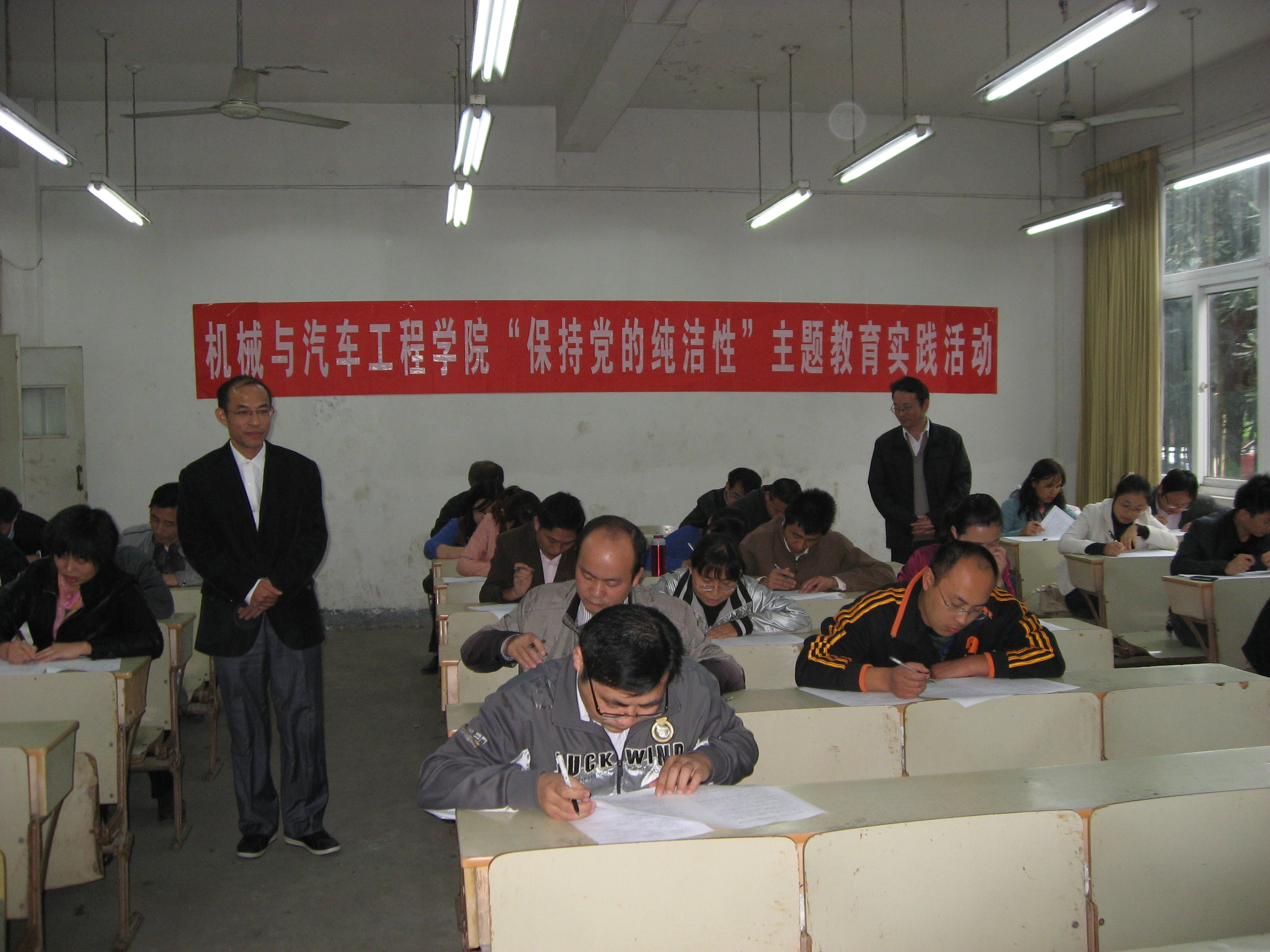 机械与汽车工程学院党委积极响应党中央的号召,贯彻落实校党委《开展“保持党的纯洁性 迎接党的十八大”主题教育实践活动实施方案》,进一步加强教工党员对“保持党的纯洁性”教育的深刻认识,迎接党的十八大的召开,2012年10月24日下午3点,在2J103教室隆重举行教工党员党史知识竞赛。为了本次活动的顺利进行,学院党委领导班子在此之前的学院会议上进行了广泛动员,号召广大教工党员能够充分认识“保持党的纯洁性”教育的重要性,以自己的积极行动迎接党的十八大的顺利召开。广大教工党员对此保持高度的重视,考前积极备考,认真复习党史知识,在整个考试过程中,严格遵守考风考纪,认真答题。考试结束后,教工党员对本次活动的意义给予充分的肯定,表示要始终保持党的纯洁性,在以后的教学和科研工作中,以自己的实行行动来迎接党的十八大的顺利召开。