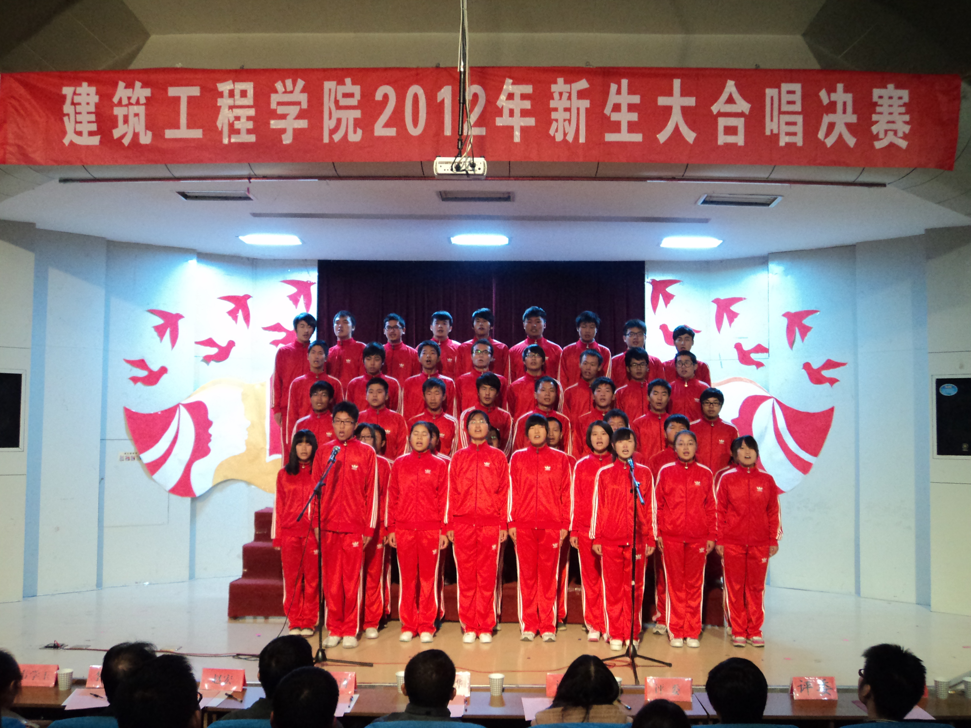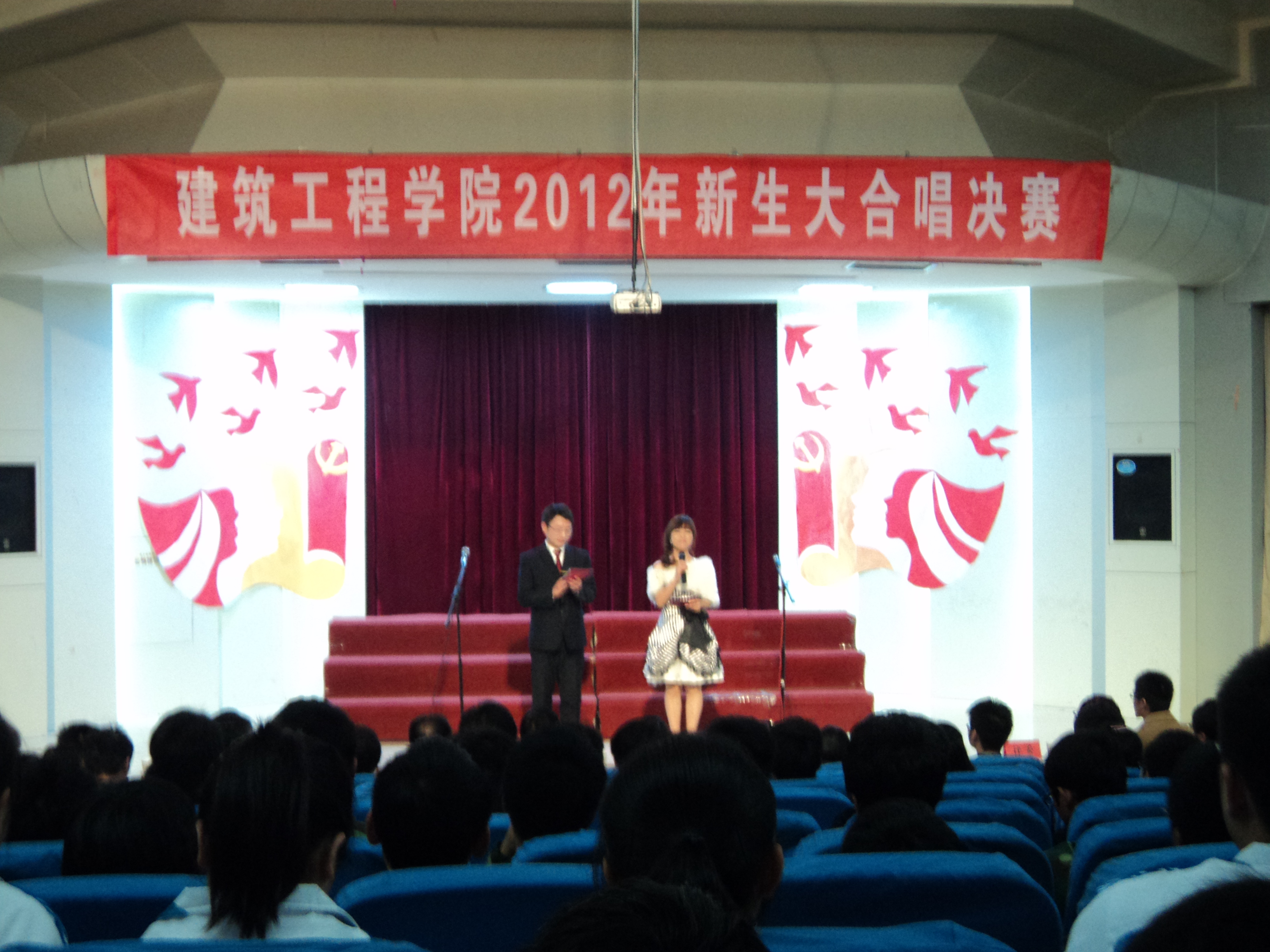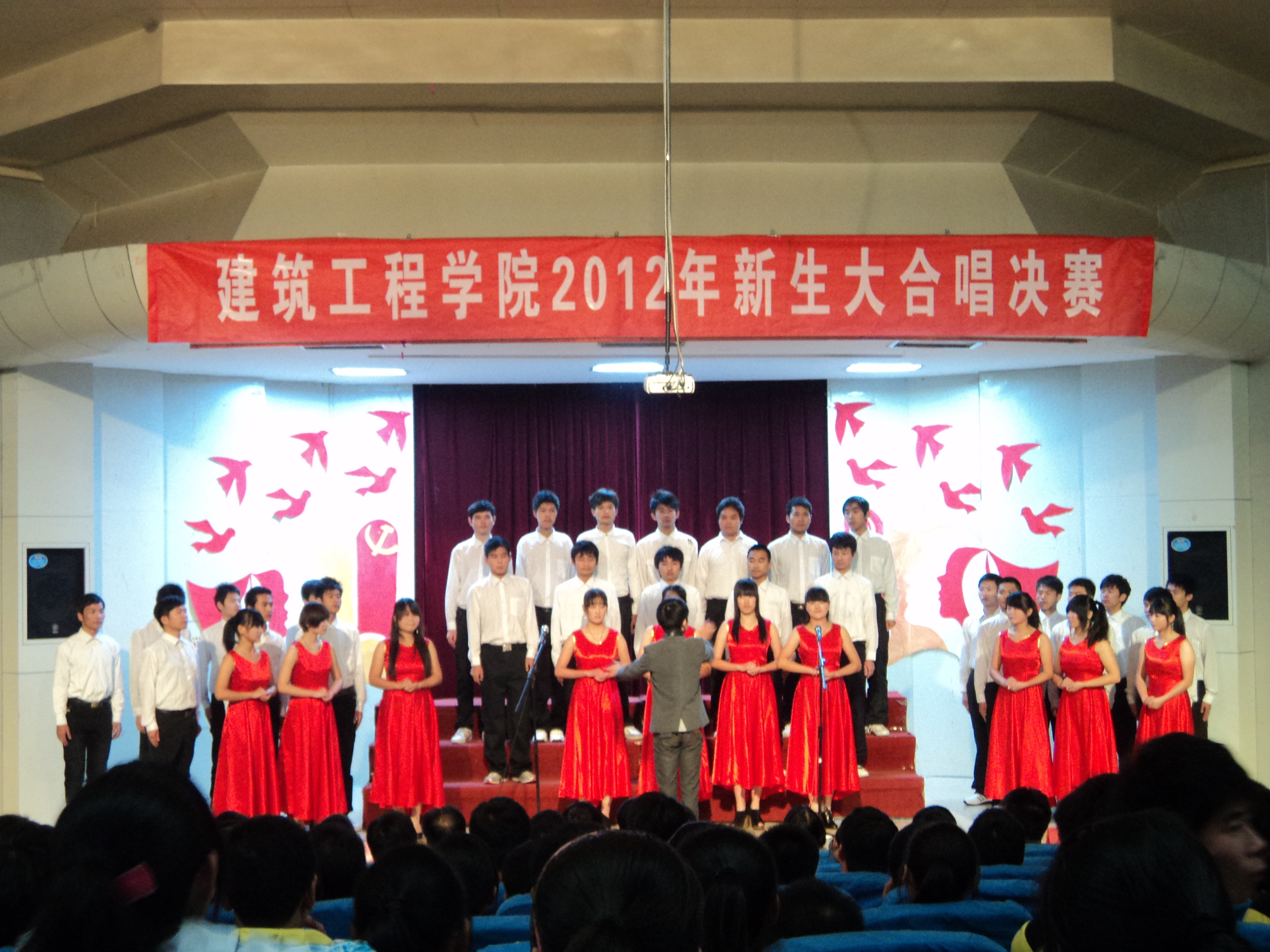 为歌颂我们伟大的的祖国,迎接党的第十八次全国代表大会胜利召开,由建筑工程学院团总支、学生会举办的“唱支红歌给党听,喜迎党的十八大”2012级新生红歌大合唱比赛经过预赛的激烈角逐,决赛于11月7日晚7:00在学术报告厅拉开帷幕。学院党总支副书记李烨、辅导员刘海涛、赵宏、韦学玉、董芬、李茜、王昌胜以及专业课教师王涛观看了比赛。特邀各兄弟学院文艺部部长担任此次大赛评委。
