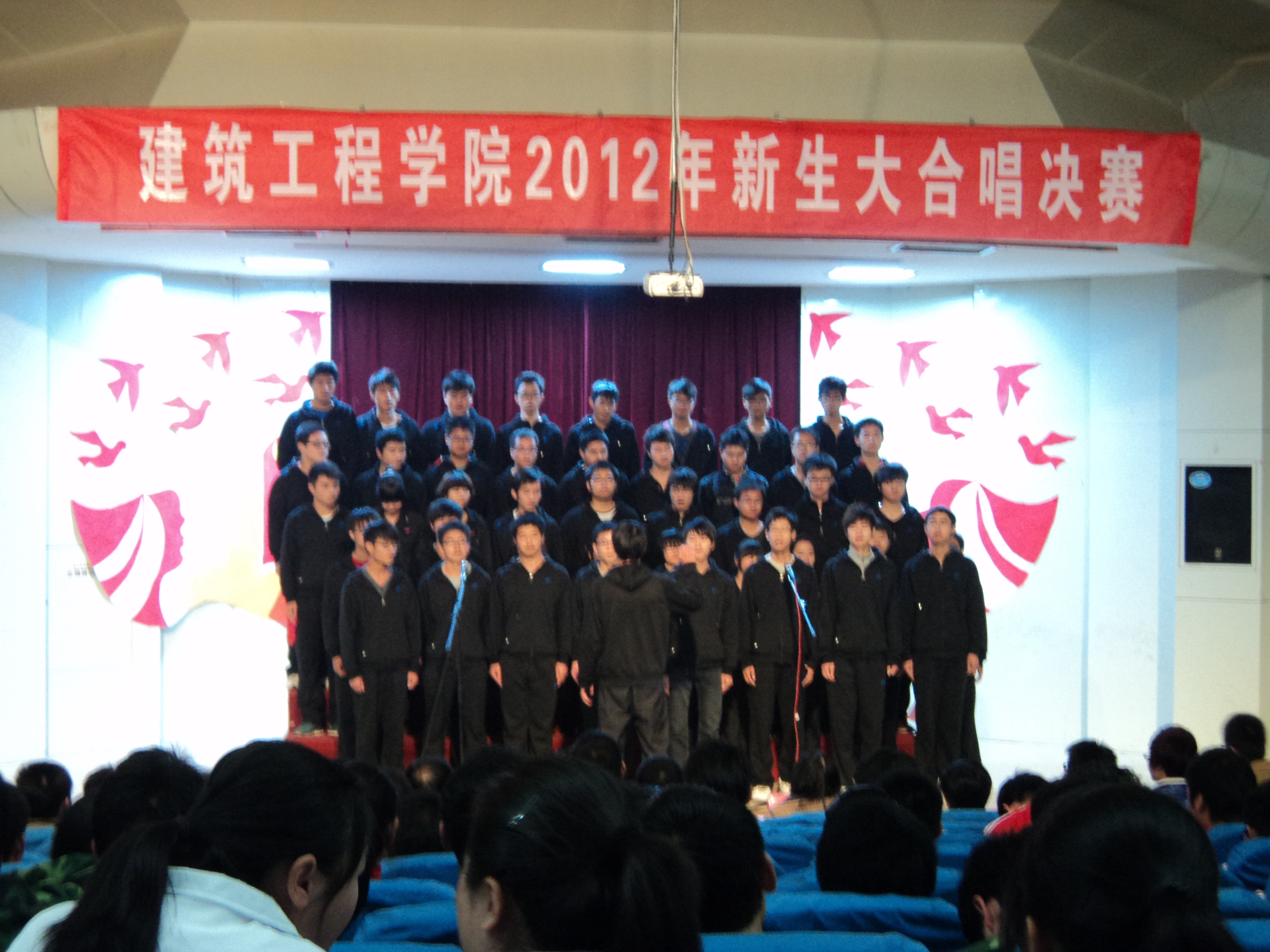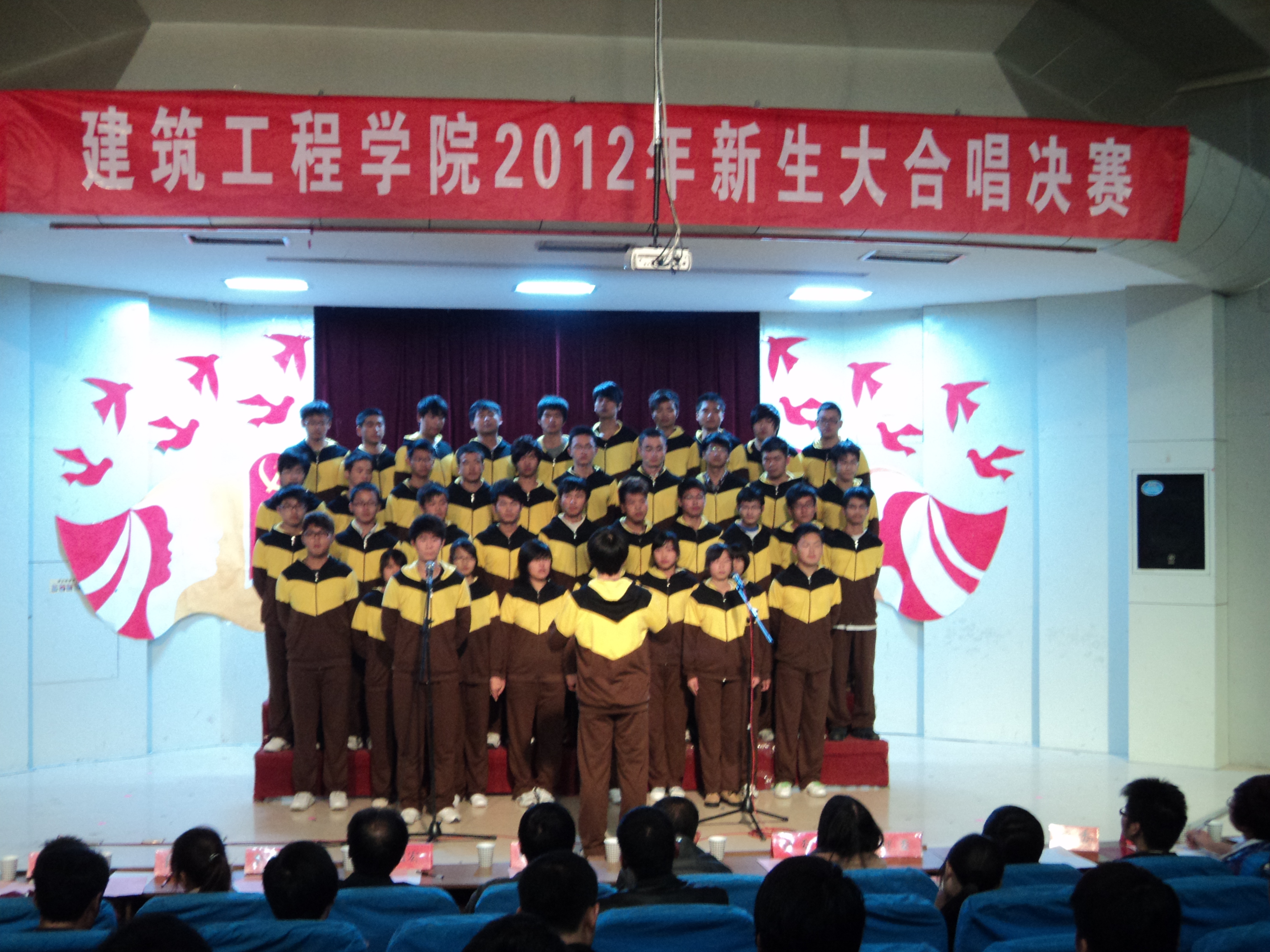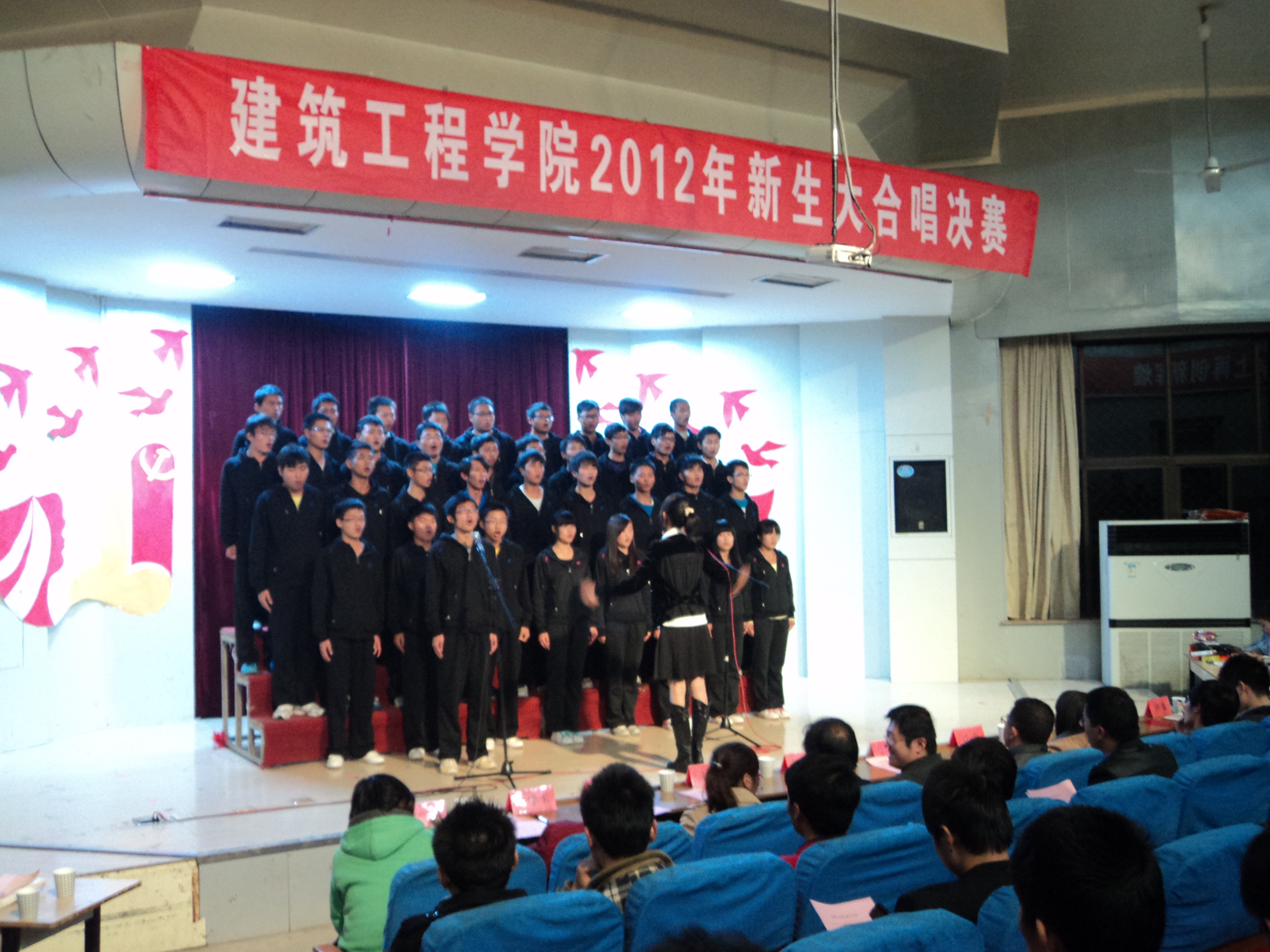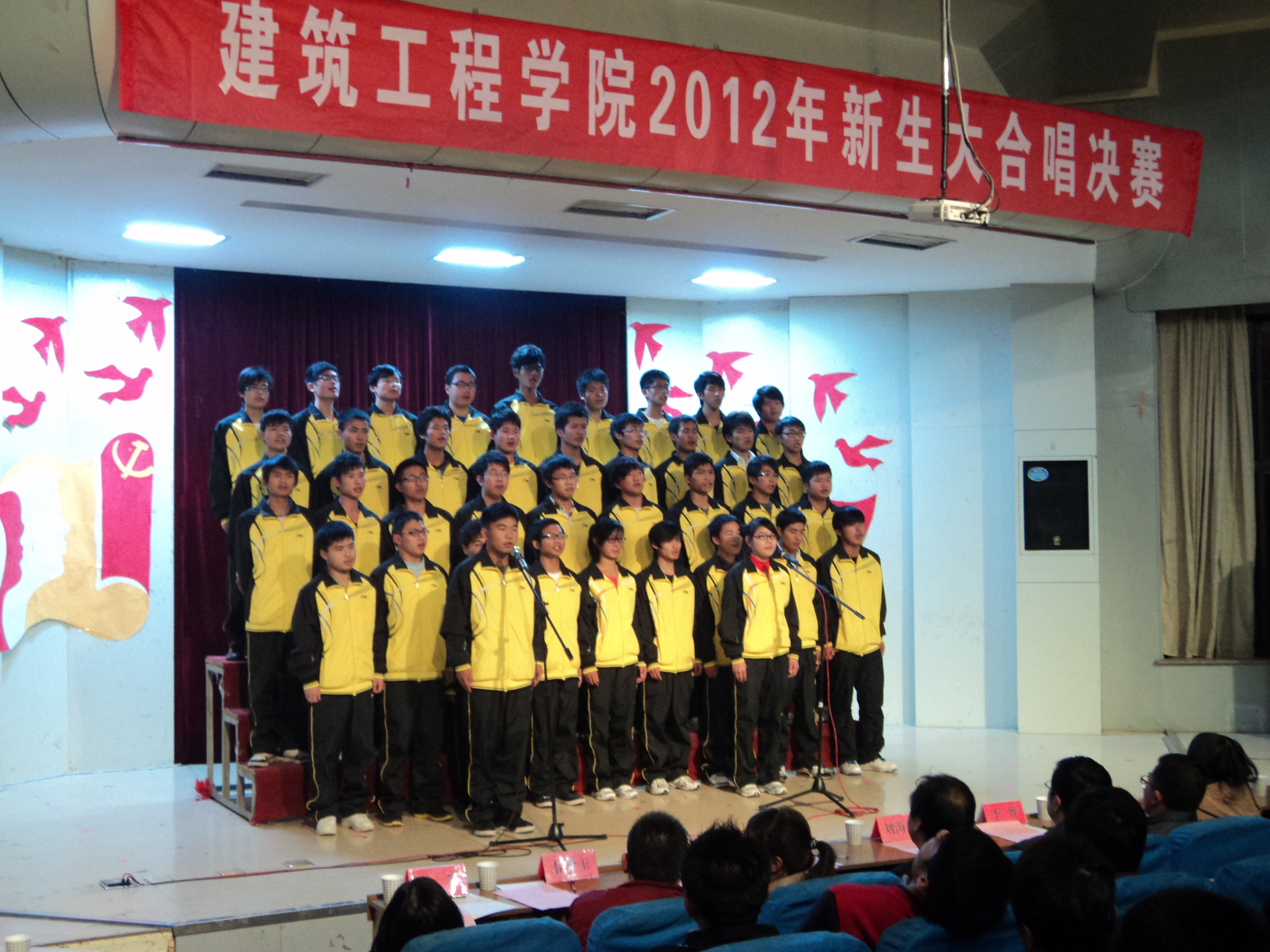 为歌颂我们伟大的的祖国,迎接党的第十八次全国代表大会胜利召开,由建筑工程学院团总支、学生会举办的“唱支红歌给党听,喜迎党的十八大”2012级新生红歌大合唱比赛经过预赛的激烈角逐,决赛于11月7日晚7:00在学术报告厅拉开帷幕。学院党总支副书记李烨、辅导员刘海涛、赵宏、韦学玉、董芬、李茜、王昌胜以及专业课教师王涛观看了比赛。特邀各兄弟学院文艺部部长担任此次大赛评委。
