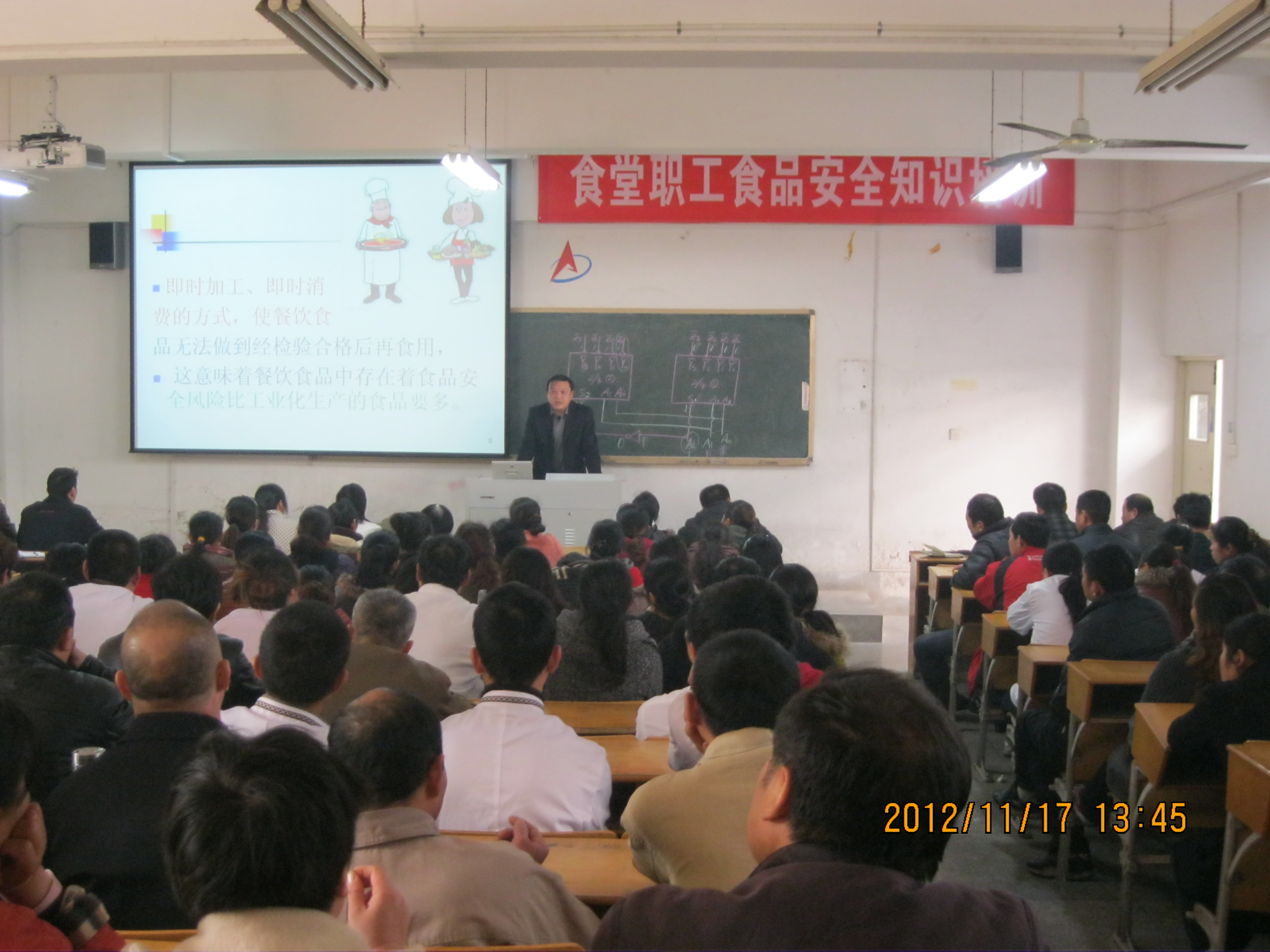 11月17日下午,后勤服务集团在四教111教室召开食堂员工食品安全知识专题培训会。膳食服务中心主任卢学根对员工进行了培训,培训内容主要包括《餐饮服务食品安全操作规范》、学校食堂食品安全管理制度以及食堂从业人员的卫生要求等内容。各学生食堂经理及部分员工共120余人参加了培训会。