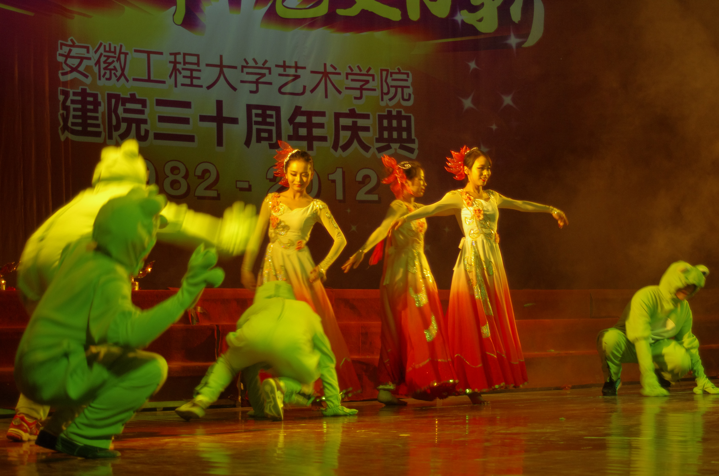 庆典大会之后,艺术学院的在校学生为学院建院30周年呈现了一台精彩的文艺演出。演出包括原创短剧《太阳的部落》、舞剧《摔壶》、民族舞《欢腾》、拉丁舞《别》、舞剧《画皮》等,演出最后在原创歌舞《老师的肩膀》的欢庆气氛中结束。