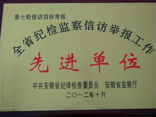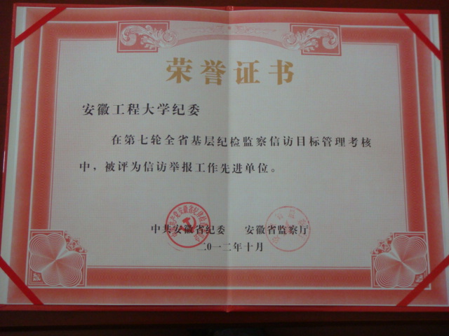 自去年11月到今年3月,省纪委对全省各基层单位贯彻落实《安徽省2009—2011年基层纪检监察信访举报目标管理规划》情况进行了检查考核。日前,省纪委印发《关于表彰2009—2011年全省基层纪检监察信访目标管理先进单位和先进个人的决定》,授予我校纪委“全省纪检监察信访举报工作先进单位”。