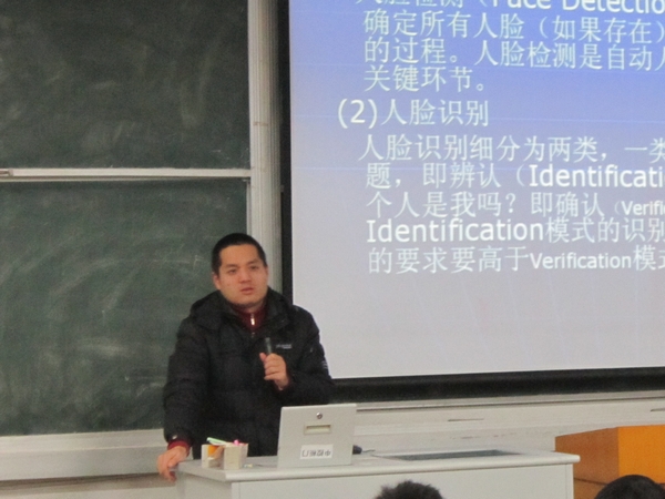 接着,他列举了国内外人脸识别技术的应用与研究现状,如:中科奥森人脸识别系统等,进一步说明了这种技术的先进性。随后,他又介绍了该技术的研究方法:基于几何特征、代数特征、连接机制的人脸正面自动识别方法。最后,卢博士指出该项技术涉及面部形态、视觉特征、光照、姿态等一系列关键性问题,并强调这是个极其复杂且富挑战性的课题,并希望有这方面研究兴趣的同学能够在这个领域做出自己的贡献。