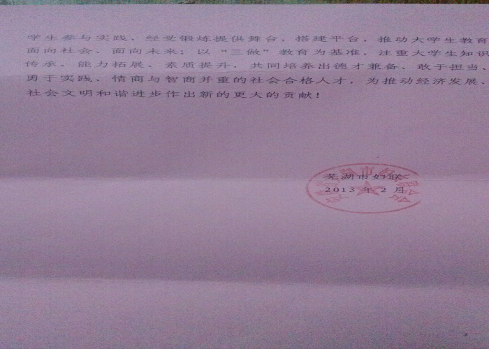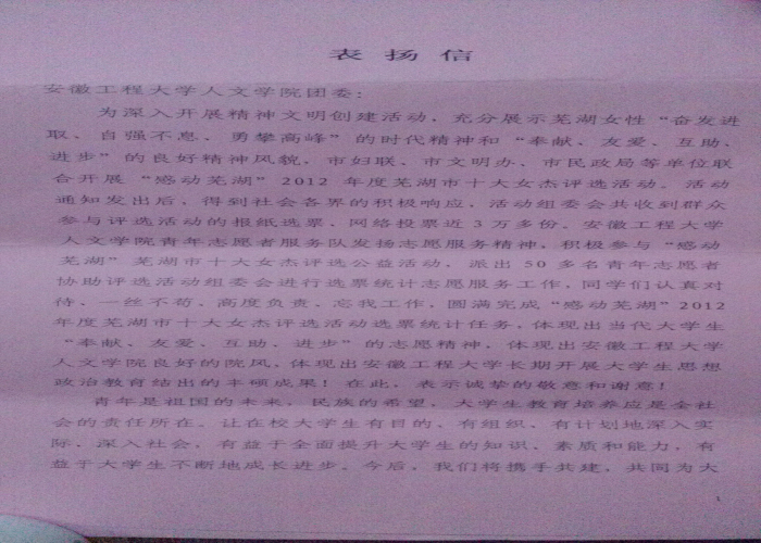 在近期由市妇联,市文明办,市民政局等单位联合开展的“感动芜湖”2012年度芜湖市十大女杰评选活动中,人文学院“阳光之旅”青年志愿者服务队派出50多名志愿者开展志愿服务工作并圆满完成任务,保证了此次评选活动的公平、公正和公开。为此,芜湖市妇联特发来感谢信。