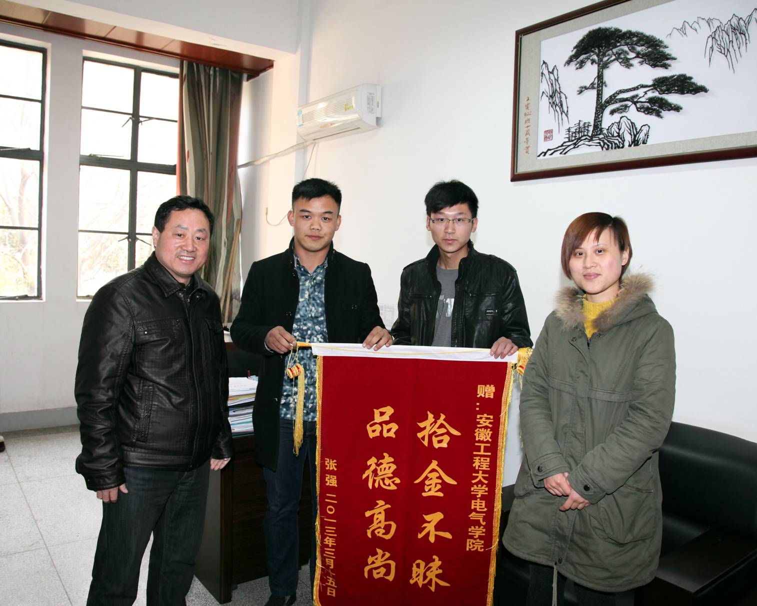 拾到4500元现金和若干张银行卡该如何选择?这样的金额对一位在校大学生来说可谓是一笔“巨款”,但我校电气工程学院光电信息工程121班刘星宇同学在面对这“巨款”时却毫无迟疑地选择了主动归还失物,这是近日发生在我们身边的一件学雷锋事迹。3月15日下午,失主张强特地到学校送来一面精心制作的锦旗以表谢意并赞扬了我校大学生良好的素质。