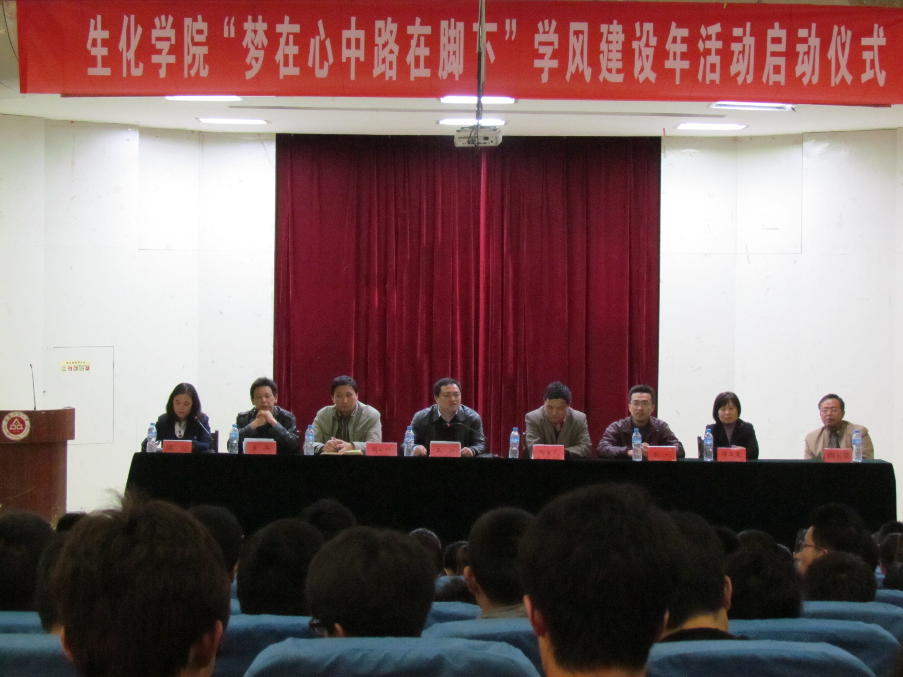 2013年4月12日下午4:30,经过精心筹备,生化学院在学术报告厅举办“梦在心中·路在脚下”学风建设年活动启动仪式暨动员大会,全面部署推进学院2013年学风建设工作。学校教务处处长陶庭先、校团委书记刘一、学生处副处长胡家增,生化学院党委书记王弘、院副院长薛正莲、副院长陶玉贵、院党委副书记章兵、各系主任、支部书记、全体辅导员以及三百余名学生干部、学生党员和学生代表参加本次启动动员大会。大会由院团委副书记胡云主持。