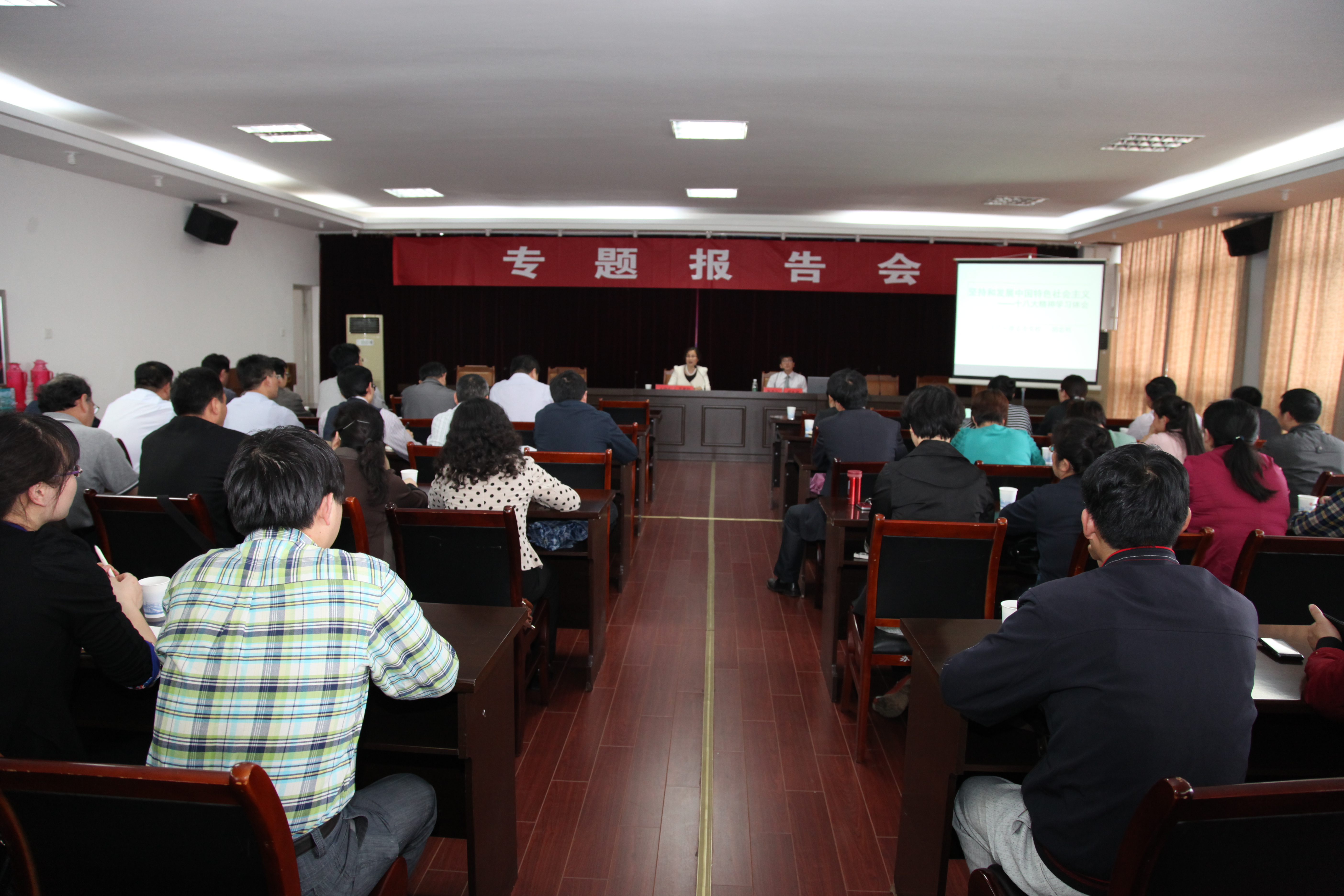为深入学习领会党的十八大精神,推动学习型党组织建设,5月17日下午,我校举行党务干部培训专题报告会。组织部邀请安徽省委党校胡忠明教授作题为《坚持和发展中国特色社会主义——十八大精神学习体会》的专题报告。报告会由校党委委员、宣传部(统战部)部长苏国红主持。党委职能部门负责人、学院党委(党总支)书记、副书记和全体辅导员参会。