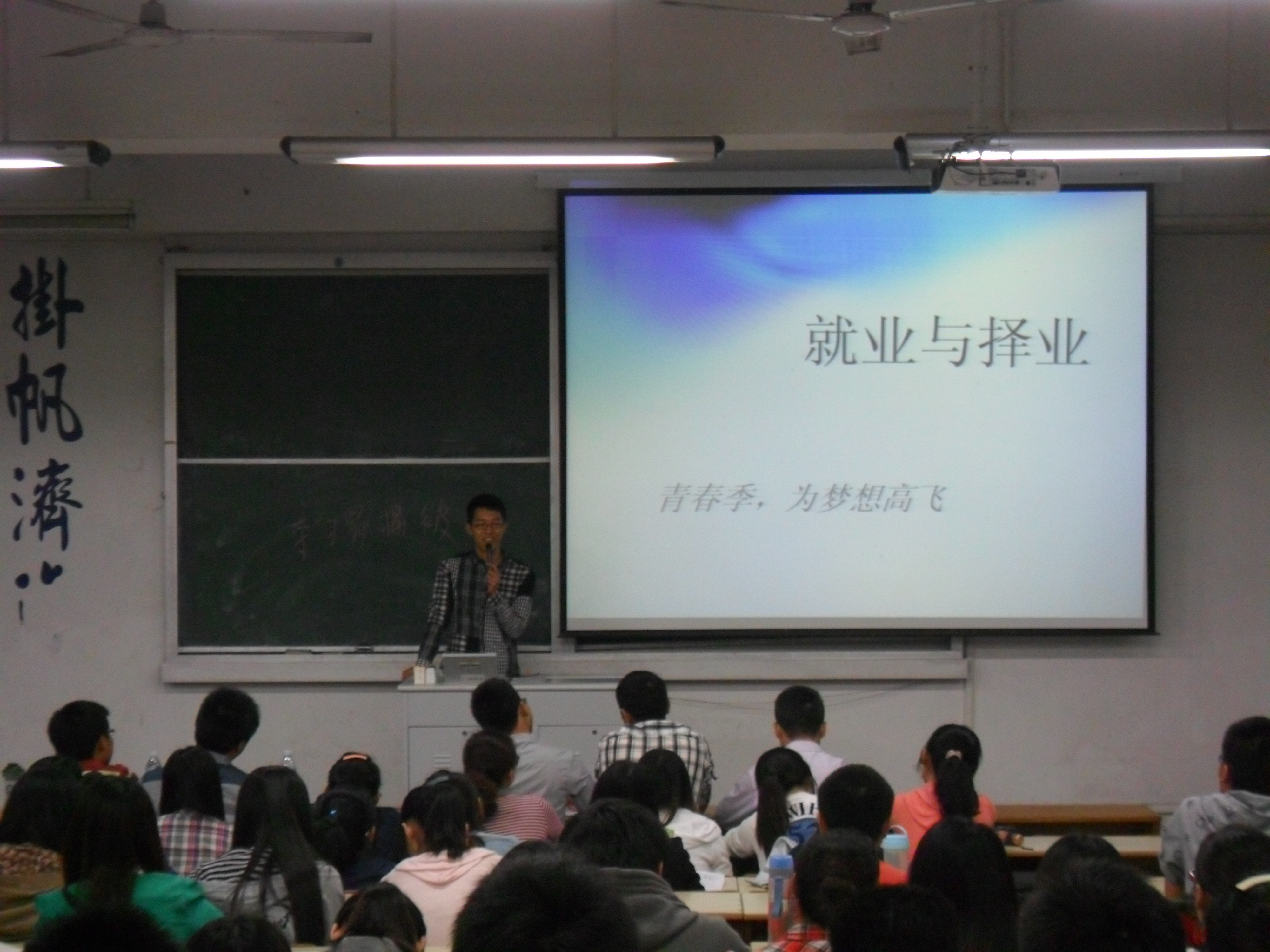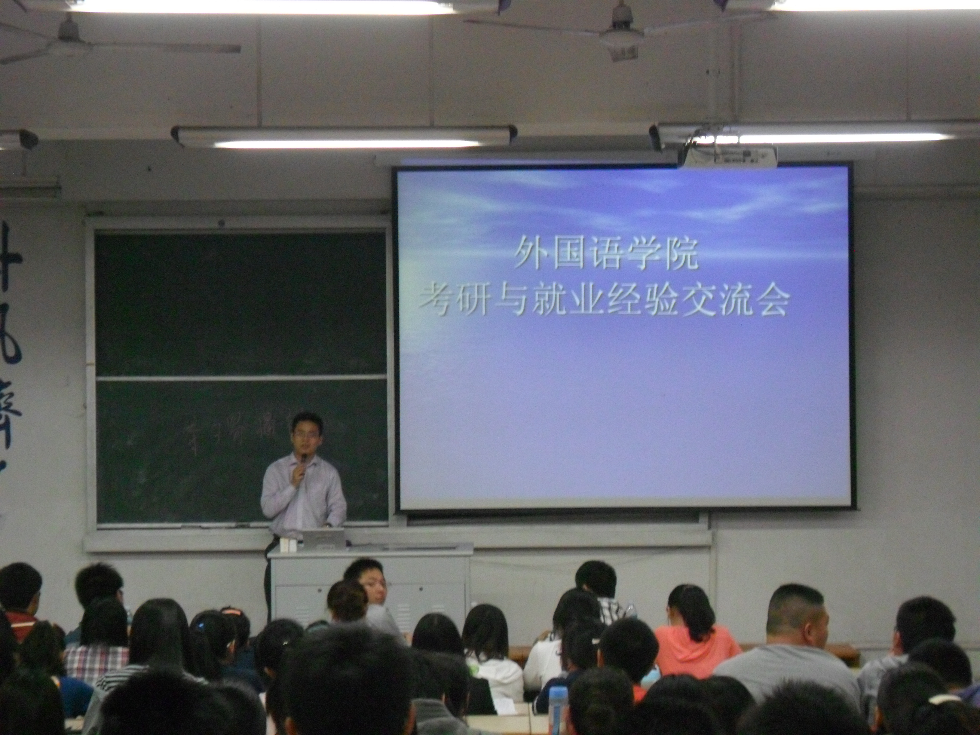 为了帮助2010级大三同学有效地确定毕业后方向,尽快地让他们在思想、行动上早做准备并指导毕业生做好从大学迈向社会这一重要转变,5月30日,外国语学院于6J106举行了毕业生就业考研交流会,参加会议的有09级优秀毕业生及10级本部与机电学院英语专业学生,辅导员李飞老师出席会议。