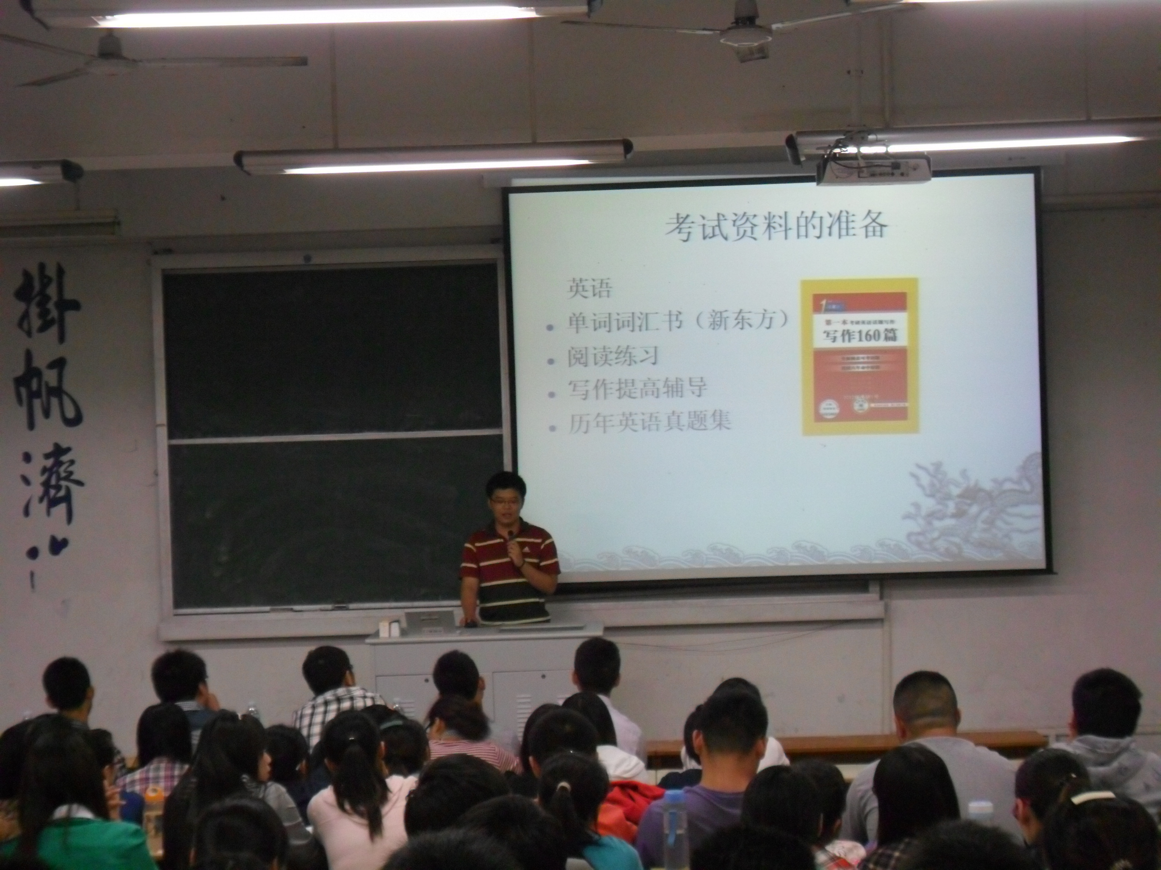 会议主要由09级优秀毕业生向低年级同学介绍他们在考研与就业中一些宝贵的经验。首先考取北师大的汪川同学,中科大的胡胜伟同学,南师大的刘云云以及川外的潘翔等四位同学,分别以其独特的风格叙述了自己的考研经历。他们就择校,选专业,笔试面试等考研环节中遇到的各种问题做出了详细的分析与讲解。其中,汪川及胡胜伟同学为我们总结了跨专业考研的经验。他们的精彩演讲博得了阵阵掌声,给在场有志考研的同学很大的鼓舞。