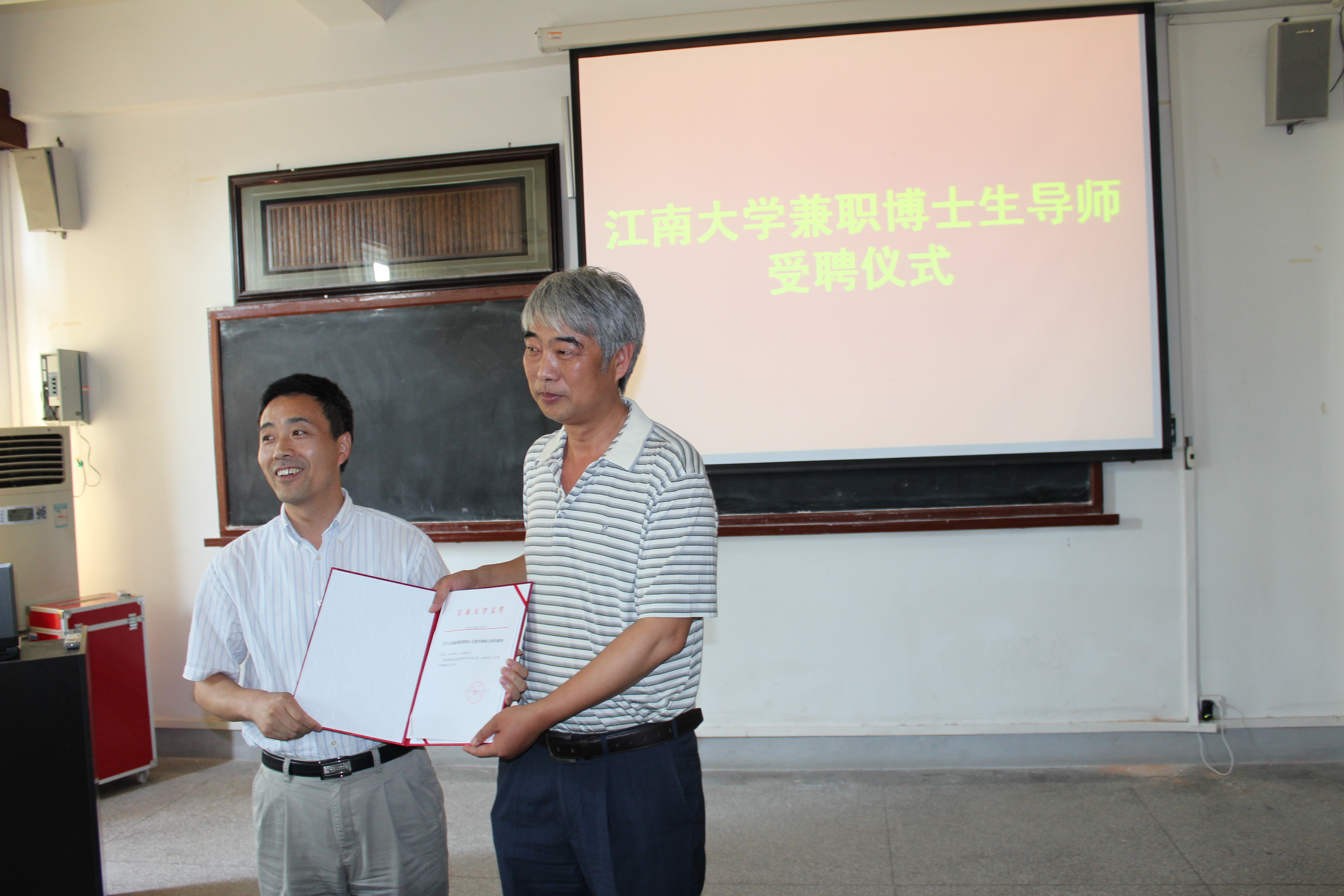 教授作为该校兼职博士生导师的文件,并为他们颁发聘书。受聘仪式结束后,陈其工、汤斌教授与江南大学的刘飞、