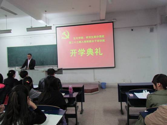 10月30日,生化学院分党校、研究生部分党校联合举办的第二十三期入党积极分子培训班开学典礼在6J113教室隆重举行。校党委宣传部副部长吴月红,研究生部党总支书记朱文藻,生化学院党委书记、分党校校长王弘,生化学院党委副书记章兵出席了开学典礼。开学典礼由本期入党积极分子培训班班主任高俊杰老师主持,学生党支部书记和全体学员参加了开学典礼。