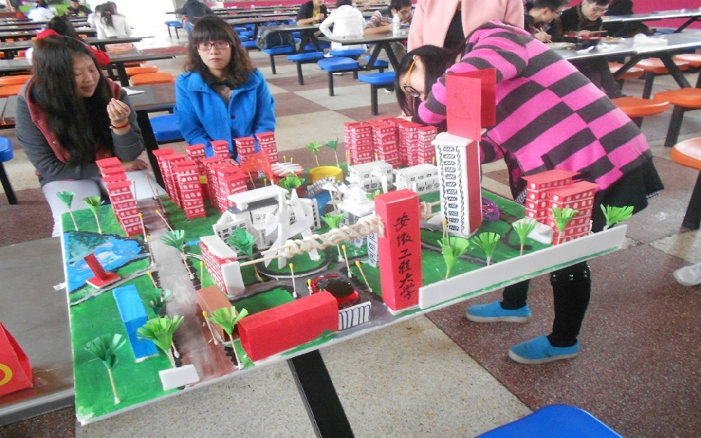 比赛现场,“丝袜”插花、“餐巾纸”婚纱、纸棍中国馆、“一次性餐筷”长城楼阁,更有纸制的RayBetApp官网下载 全景缩略图等,一件件精美的手工艺制作品展现在大家眼前。它们或宏伟壮观、或精致玲珑、或新颖独特、或古典优雅,令人目不暇接,享受了一场视觉盛宴。参赛作品大都使用二次利用材料,既简单环保,又不失美感,作品中更是融入了制作者们对祖国大好河山的热爱之情,真挚感人。最终,13级朱行政、12级韩梦娟、曾伟平团队获得本次比赛的一等奖。