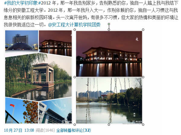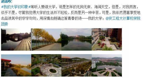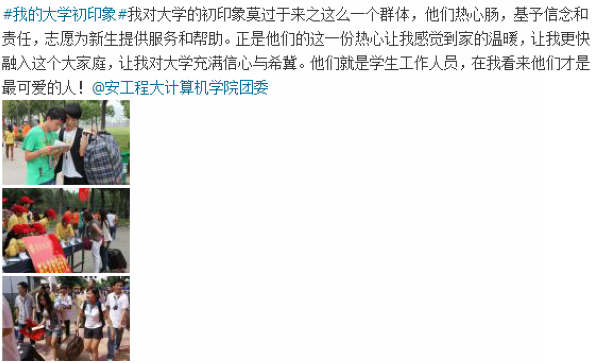 经过前期的充分准备和宣传,本次活动不仅得计算机与信息学院学生的积极响应,也得到了其他学院的同学们的关注和参与。从收到的作品和获奖作品的作者所在学院看,这次活动成功地举办成了一项全校性的活动。此次微作品征集大赛,让更多新生了解和收听学校团委系统的官方微博,也扩大了计算机与信息学院团委官方微博在广大团员学生中的影响力。