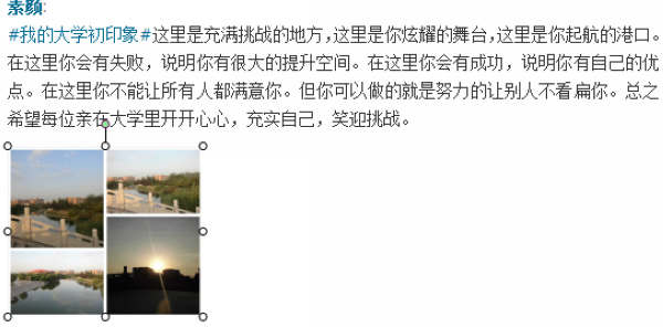 新生们上交的微作品从形式上看,各有千秋,“照片”、“视频”、“文字”穿插于微博之中,生动地展示了同学们的大学新生活;从内容上看,深刻而丰富,激扬热情,富有情趣,选手们从各个角度来叙述了自己的“大学初印象”,包括“军训”、“运动会”等等开学初到现在的活动,饱含了他们来到大学的初期感悟和对于未来的期望。其中一等奖得主顾明志独树一帜,以视频的形式展现了学校的优美环境与浓厚的书香气息。