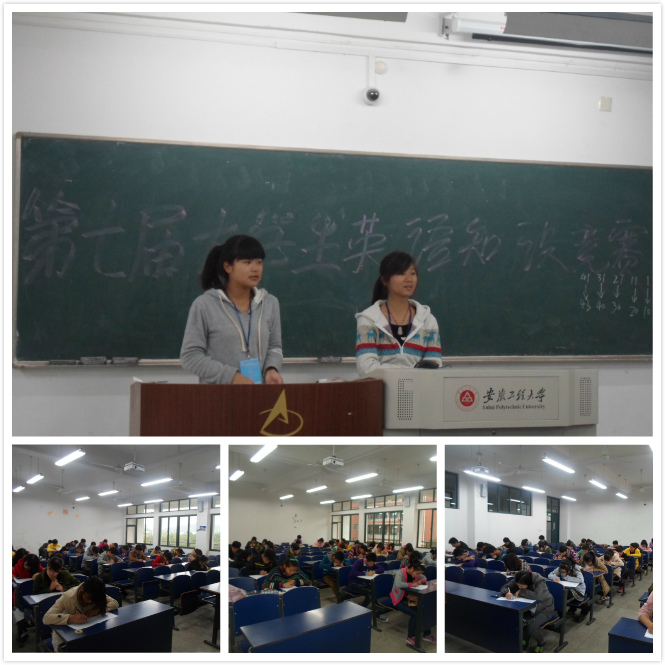 为加强学风建设,营造英语学习氛围,丰富校园文化生活,11月3日上午,作为校第十二届大学生课外学术科技节系列活动,由外国语学院团总支承办的校第七届大学生英语知识竞赛在6号教学楼举行。