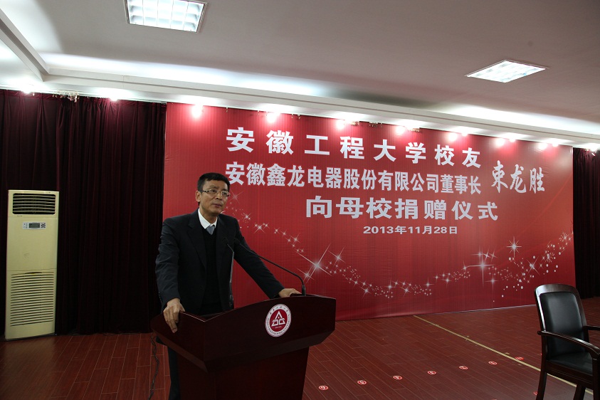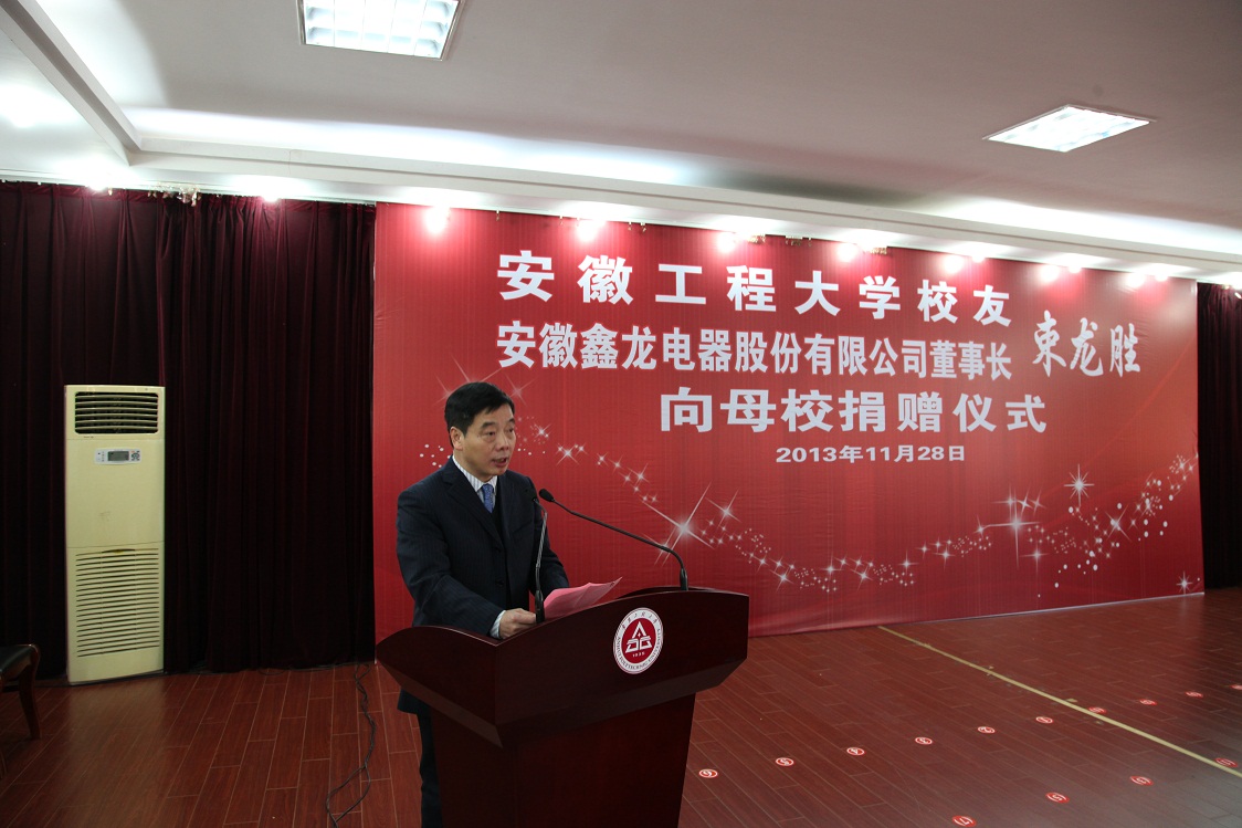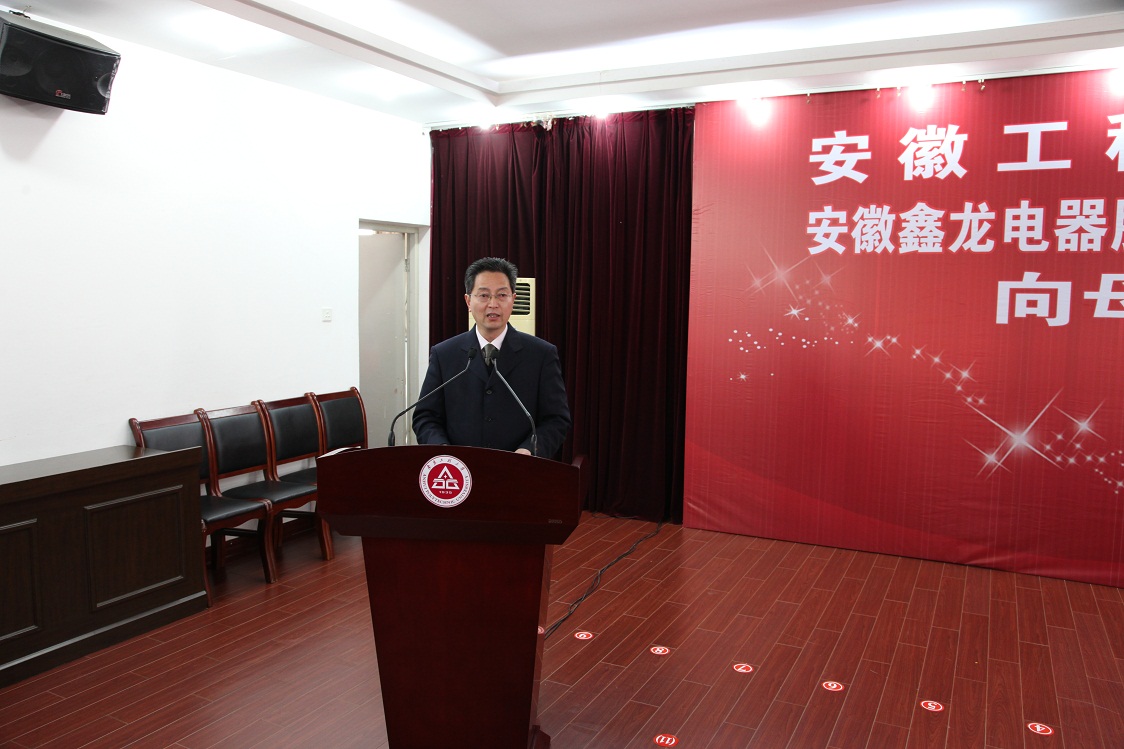 校党委书记陈其工致欢迎辞。他代表学校对参会的领导嘉宾和束龙胜的慷慨捐赠表示感谢,盛赞束龙胜对母校的深厚感情和作为一名成功企业家的博大胸怀,简要回顾了束龙胜校友创业历程和安徽鑫龙电器股份有限公司事业发展成就以及公司和母校在校企合作方面取得的显著成绩。他指出,束龙胜的义举将激励师生员工以更加饱满的热情,为推动学校事业快速发展不懈努力。学校一定会倍加珍惜和爱护校友回馈母校的情谊,认真落实捐赠支持项目,努力办好人民满意的高等教育,不辜负校友对母校的殷切期望。