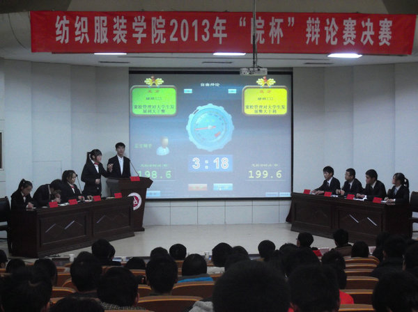 此次比赛共有12支班级代表队参加。经过多场角逐,轻化132班、纺织123班、轻化131班、纺织133班四支代表队进入四强。在第一场季军争夺战中,双方代表队围绕“行动与比信仰哪一个更能指引我们成功”展开激烈的交锋。第二场冠军争夺战,双方代表队就“宽松管理对大学生发展的利弊”展开比拼。比赛初始,正反双方立论鲜明,论据充分。在攻辩和自由辩论环节中,双方唇枪舌战,攻防有序,富有创意的提问和机敏的回答赢得了现场观众一次又一次的的掌声。最终,经过评委会的裁定,纺织123班代表队勇夺桂冠,纺织133班代表队和轻化131班代表队分获亚军和季军,轻化132班代表队获得优秀组织奖,纺织123班的孔进阳荣获本次辩论赛“最佳辩手”称号。至此,纺织服装学院2013年“院杯”辩论赛圆满结束。