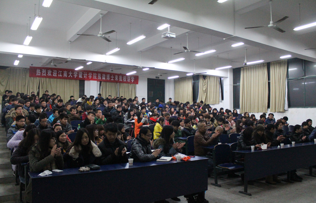 熊微博士围绕“怎样才算好设计”的主题,从“设计改变生活,设计创造价值”的角度入手,深入剖析了好设计的概念。同时,他带领全场师生回顾了前现代、现代、后现代的设计发展历程,将设计的阶段性目标精辟概括为前端做人、中端做事、后端做物、末端做钱。最后,他通过十个案例解析,概括出好设计的“五个一”标准:一望便知、一学就会、一体成型、一点即通和一贯表里。他鞭策同学们要学会运用巧妙对接、离散重构、多重语义、思维完形等多种设计方法,并强调设计过程中的可理解性、易用性、交互性、关联性及文化性等要求。熊微博士以渊博的知识、诙谐的语言赢得了全场师生的阵阵掌声。