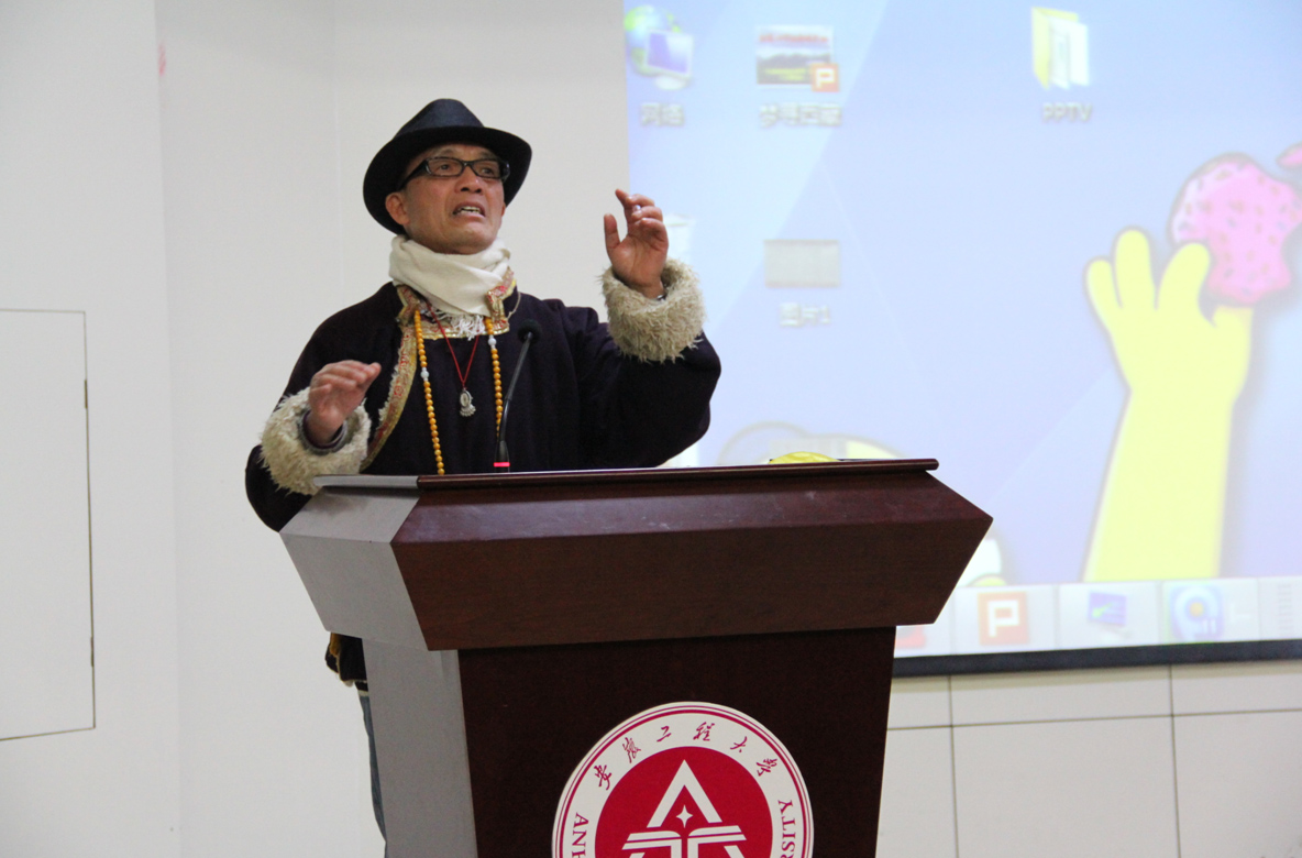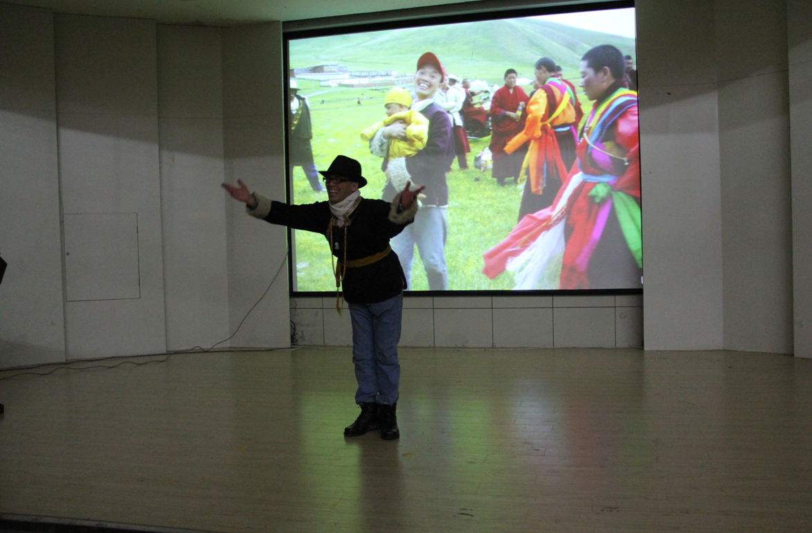 项宁老师身着藏族服饰,表达了对藏族文化深深的喜爱。他回忆自己退休后寻梦于雪山之巅,并且与格蒙寺孤贫学校的孩子在艰难环境下共同生活与学习的经历。“浪漫彪悍的轻骑兵”、“多勤辛劳的高原红”、“露天温泉见大卫”等经历被项宁老师演绎的淋漓尽致。同时“尊师重教的传承”、“个体智慧与群体力量”、“雪域高原殊胜缘”等生活感悟也使场上师生的心灵受到了洗涤。他还播放了舞蹈短片《雪山之魂》、小品《太阳部落下的五星红旗》,并且现场演唱歌曲《香德尼玛扎溪卡》,表演藏族舞蹈《金刚舞》。项宁老师的表演引起全场师生的强烈共鸣,同时也让全场师生感受到少数民族文化的精彩。