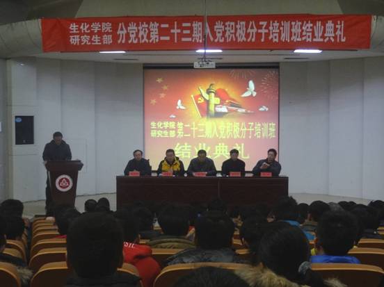 12月24号下午,生化学院、研究生部分党校第二十三期入党积极分子培训班结业典礼在学术报告厅隆重举行。校办公室主任、生化学院党委书记王弘,研究生部党总支书记朱文藻,校党委组织部副部长王勇智,生化学院党委副书记章兵,生化学院党委委员、副院长陶玉贵,各学生党支部书记及辅导员老师参加了结业典礼。结业典礼由班主任高俊杰老师主持。