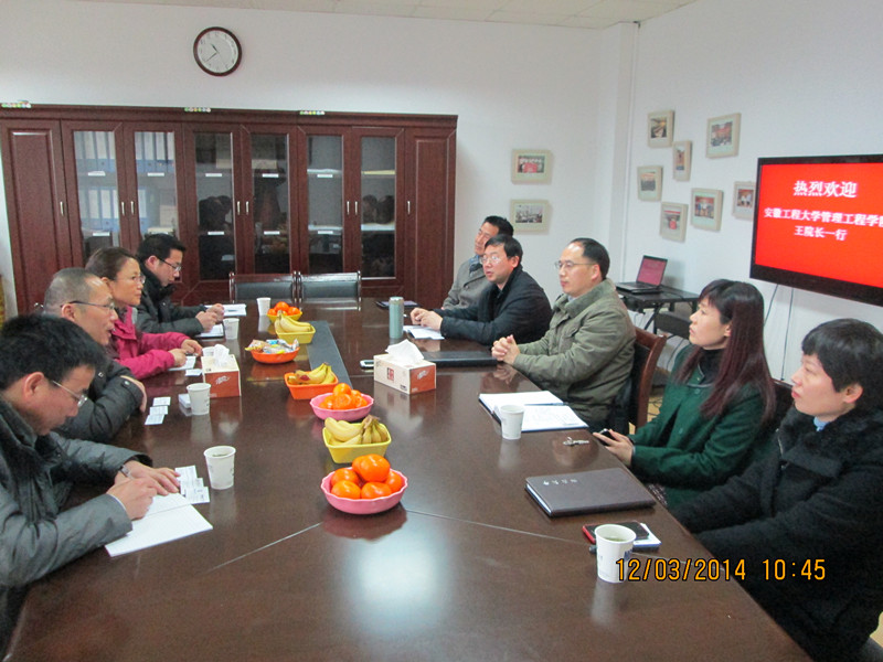 在安徽财经大学,商学院院长宋思根率学院主要领导和相关专业负责人热情接待了王忠群一行。双方就辅修专业(双学位)中学生选课、教学方式改革、教学质量控制和激励机制等方面进行了热烈的讨论和交流。