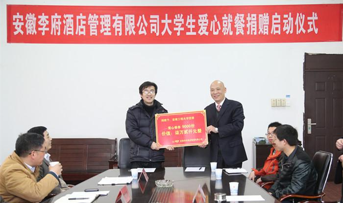 “爱心就餐计划”作为学校“团百花”学雷锋活动的一个项目,得到了安徽李府酒店管理有限公司大力支持。捐赠仪式上,校伙管会学生干部汪歆首先介绍了大学生爱心就餐计划的策划和前期筹备情况。校团委书记刘一与安徽李府酒店管理有限公司董事长辛国芳签订捐赠协议并接交了爱心餐劵9000份,共价值7.2万元。辛国芳董事长在会上表达了支持爱心就餐计划的初衷和接续开展爱心就餐活动的意愿。校后勤集团总经理魏长顺感谢李府公司的支持,充分肯定了伙管会学生干部的工作成绩,并介绍了全校餐饮服务、饮食安全、食堂发展等有关情况。