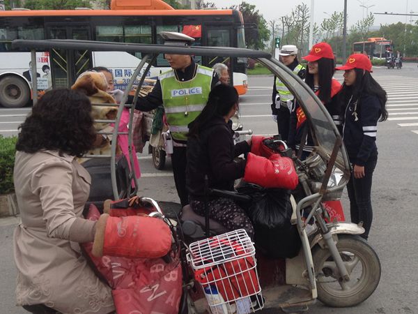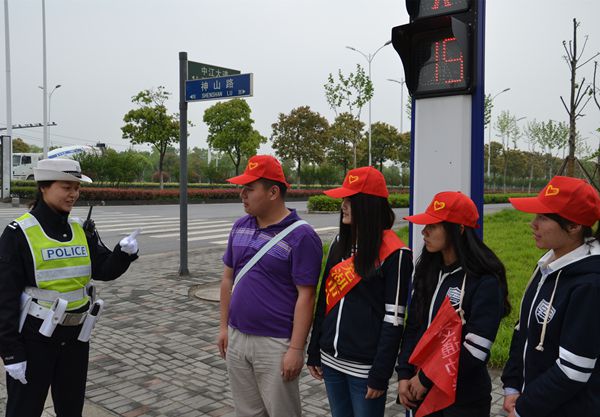 4月16日下午,由计算机与信息学院软件131班同学们组成的“和谐花”志愿者团队来到神山路与中江大道十字路口处,协助交警开展交通疏导志愿者服务。
